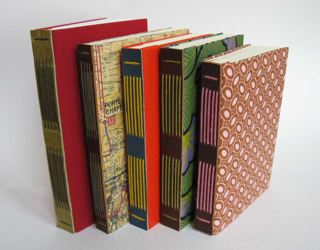 Well, Big Jump Press has the flu today, as it did yesterday, and the day before. So no exciting letterpress or mockup action is to be had. Rather a lot of moaning and sniffling, though. This seems like as good a time as any to take photos of a sampling of the blank journals that I have been working on in my spare time. Above are several samples of long and link stitch bindings. Some of these have book cloth covers, others are bound in decorative and even flocked papers and sewn with linen thread. Below: long stitch bindings with screen printed, oiled coverstock paper, and a simple link stitch binding with letterpress printed covers. Tomorrow I hope the flu will be gone, and it will be time to get back to the studio, continue with the screen printing class I’ve been taking, and get back on the press. I’ve also ordered 500 sheets of paper for more of these blank little numbers, so stay tuned for more! Unless the flu never leaves me alone, in which case it may be time to stop reading this blog before it turns, inevitably, to darker subjects.