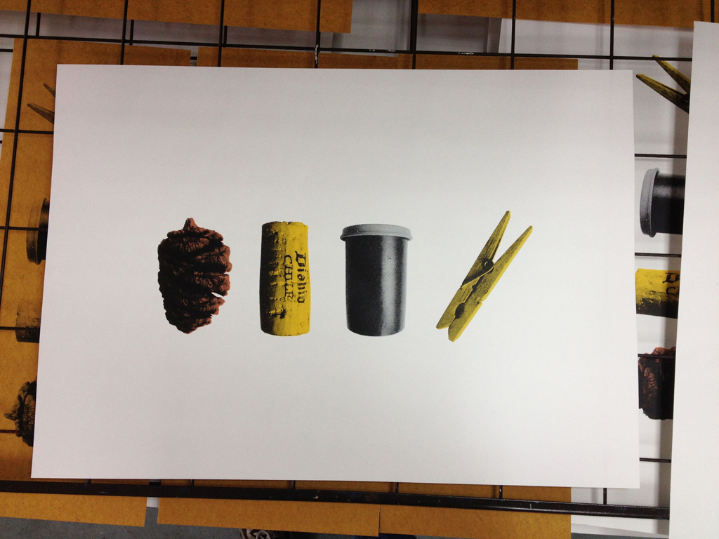 Here it is, a the fruit of my screen printing labors! And at 23 1/2″ x 16 1/2″ it is my biggest print so far, and impossible to do on my vandercook without some kind of paper engineering magic. Four objects, five colors. Now it is time to take a break from the wonders of screen and get my files ready to send away for letterpress relief plates. The design of the book is almost finished, time now to look at paper samples and start to make a plan of action for the puzzles of registration. More on that tomorrow. Below: photos of the process, printing the yellow layer of the cork.