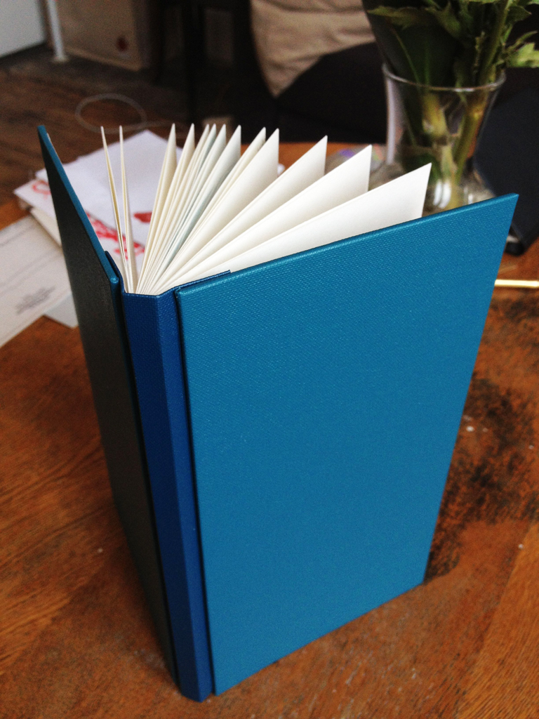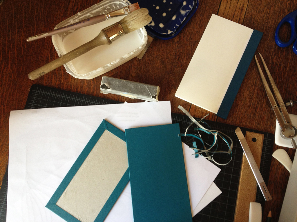 More buckram has arrived in the post (always fun when a tube turns up) and so there is plenty for more tests and mockups. Today’s task: a mockup using the materials that I plan to use for the edition, in this case Buckram and Zerkall paper as well as other bits of this and that. If there are going to be any big problems with the structure, it is best to find out now rather than later when a U-turn is impossible.