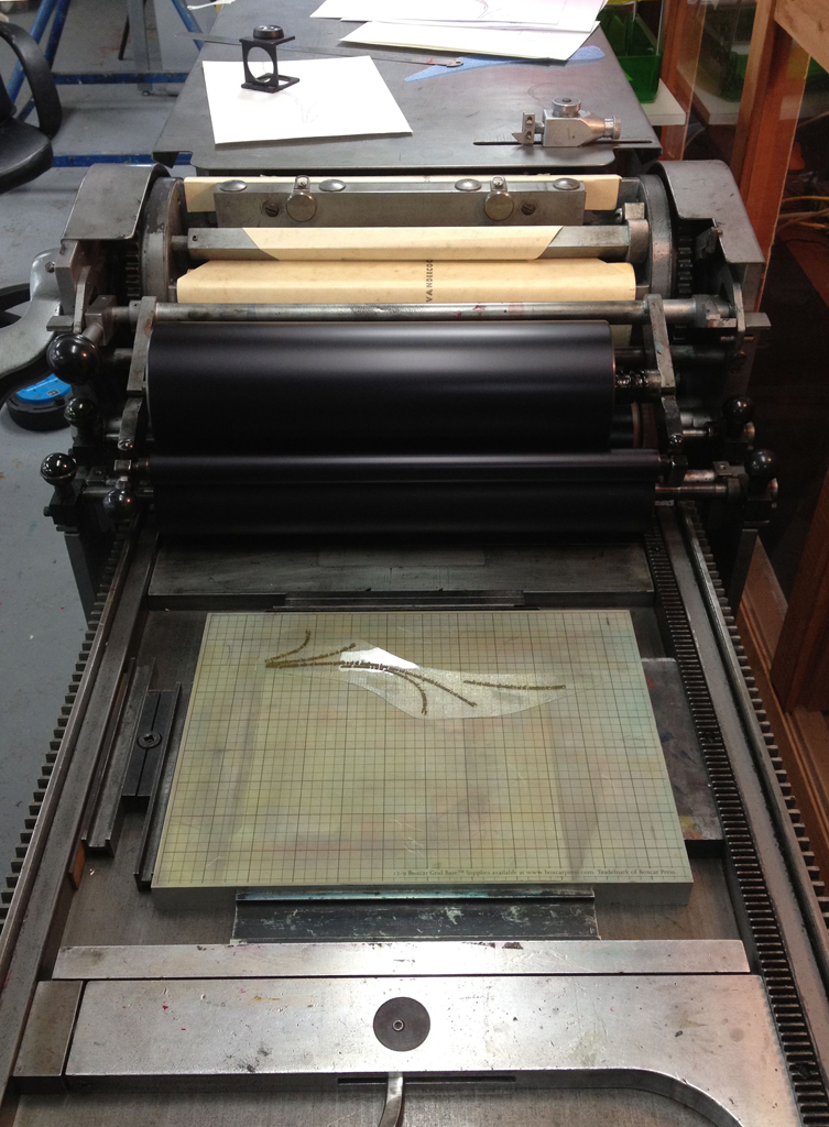 Below, the Vandercook SP-15 in all it’s glory, plate ready to go in the bed, black ink on the rollers. Press run #1 for the new book.