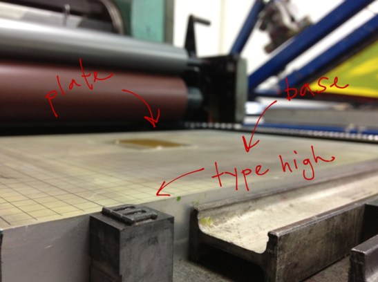 Everything in the bed of the press is designed to be a certain height so that the ink evenly coats all of the surfaces that are supposed to print. This height is related to the historical height of metal type (.918 inches) and so is referred to as “type high.” Today I am printing from a plate that is stuck to a metal base, but you can see below (thanks to a handy piece of type) that the combination of the metal base plus the little plate stuck on top is type high.You can print from all kinds of things as long as you bring them up to this specific height. Anything lower will not get a coating of ink, anything higher can damage the rubber rollers.
