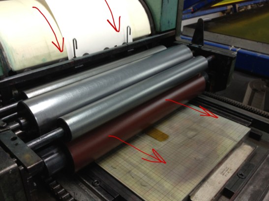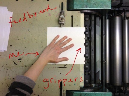 Using the big crank on the side of the cylinder, I begin to move the cylinder forward. The paper is carried along by the grippers, curving over the cylinder towards the plate that waits below in the bed.