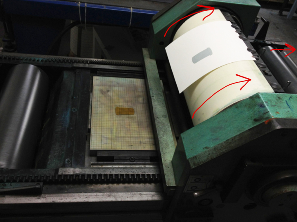 The paper, still held by the grippers, is smashed against the plate as the cylinder rolls over it. The ink is transferred to the paper and the paper is given that ‘bite’ or impression that is associated with letterpress printing as it is forced with high pressure against the plate. The amount of this impression, the depth of the bite, is determined by how much paper is wrapped around the cylinder. The more paper (called ‘packing’) there is around the cylinder, the higher the pressure against the plate and the more intense that bite into the printed sheet.