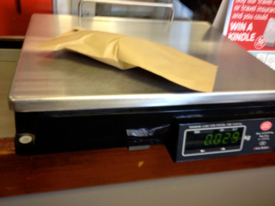The woman behind the counter of the post office in my neighborhood is unpleasant. Whenever I have bought a stamp or mailed a package from her, she treats me like I just knocked on her door and asked her for money. She doesn’t seem like the kind of person who would let you borrow the scale. But look: