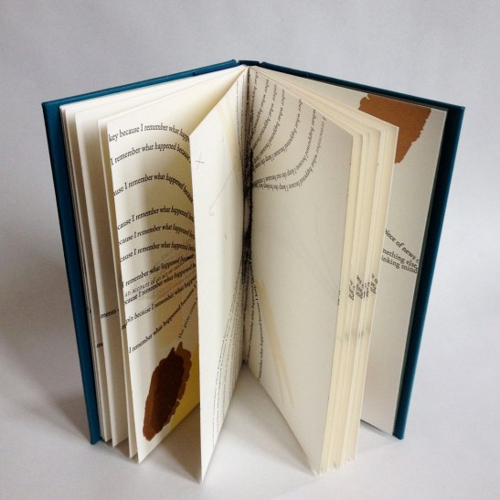 2. After having printed on the buckram, be patient and let it dry before rubbing all over it with my fingers and making ugly finger smudges in the ink. (Compare smudgeless printing above with smudgeful book cover below.)