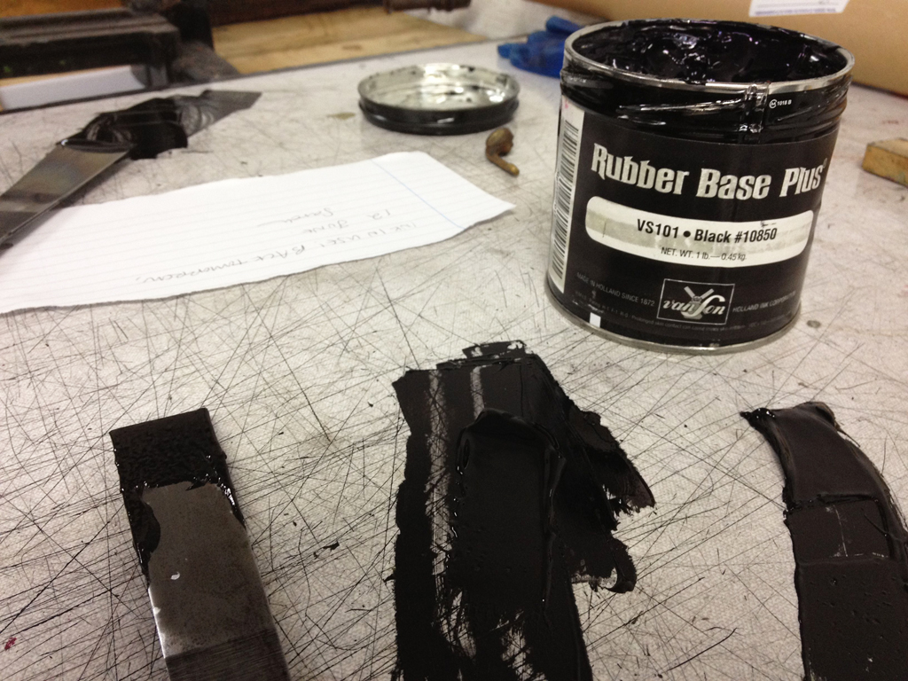 To begin, I mixed my ink. As you may or may not remember, I had some serious trouble with my black ink a few weeks ago. Having done some serious excavation, I have found some useable ink in the center of a stiff mass and so I can move forward with my printing life having learned an important lesson about shipping things in sub-zero temperatures.