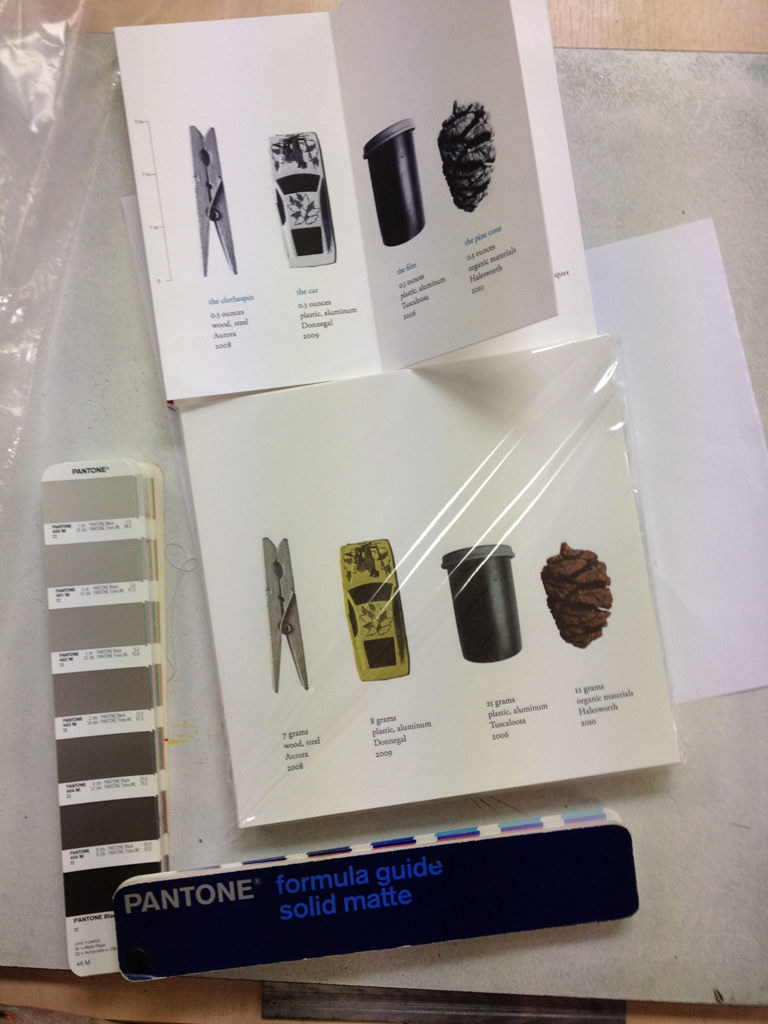 I devoted the following morning to the headings. In my original design, I had pegged the headings as blue (as you might be able to see below: the folded folio on the top is a mockup.) Looking at the finished folios, however, I reconsidered and selected a warmish gray. Mix this, ink that, register that and bing bang boom it was time to print.