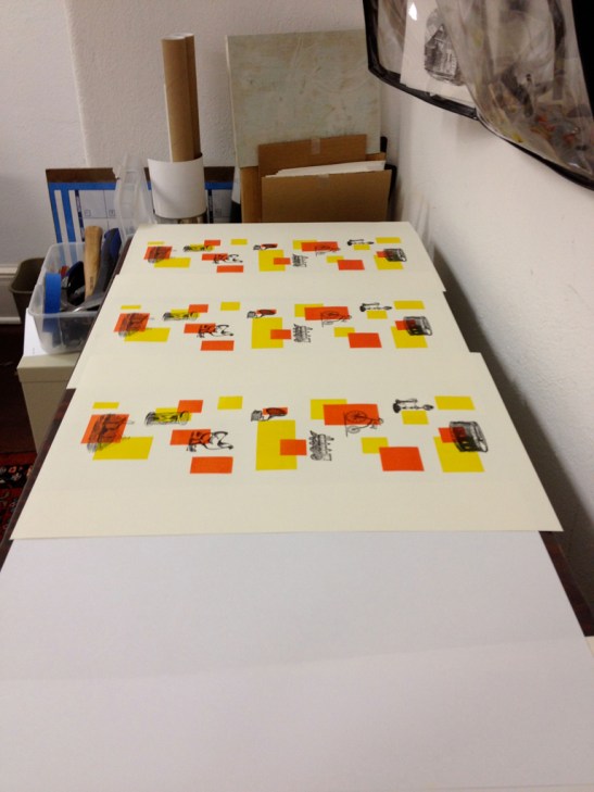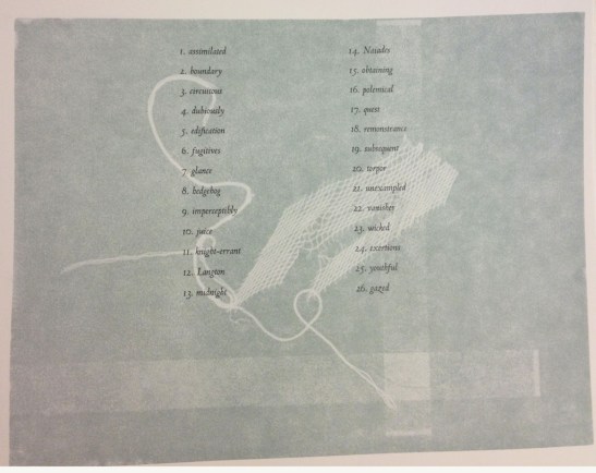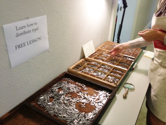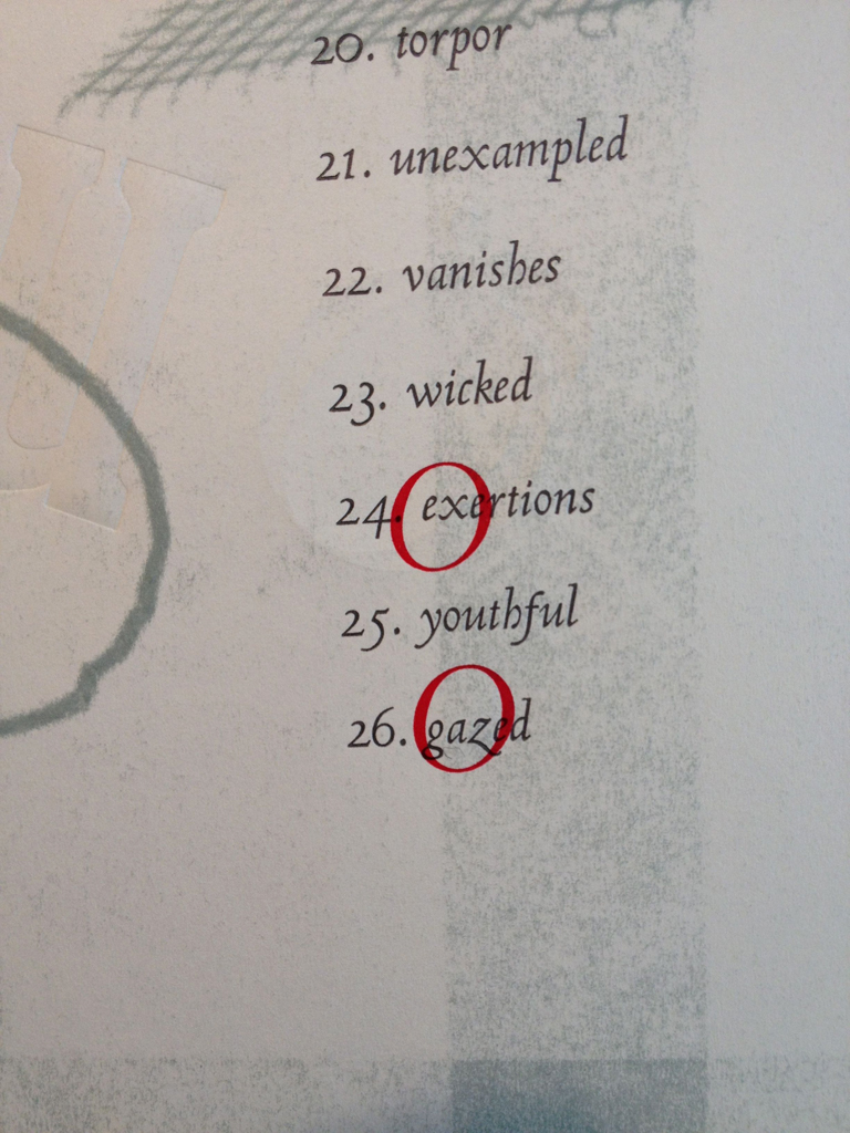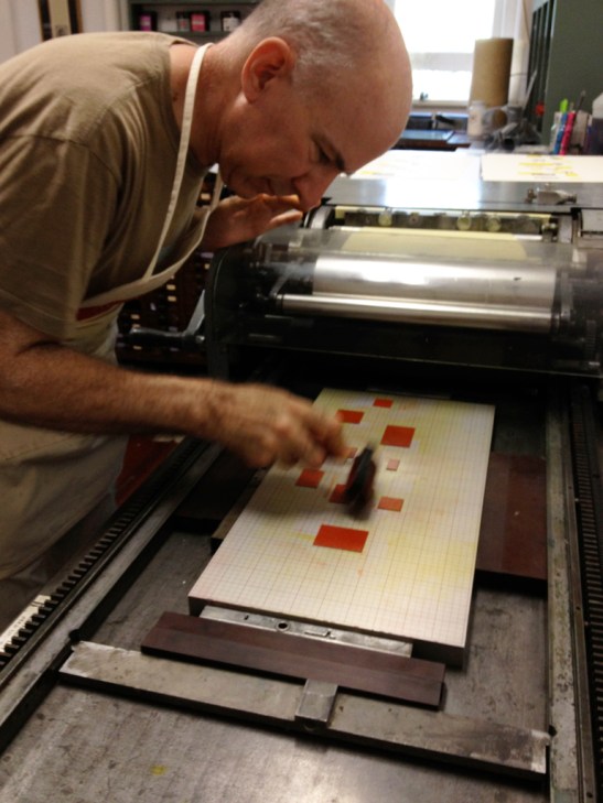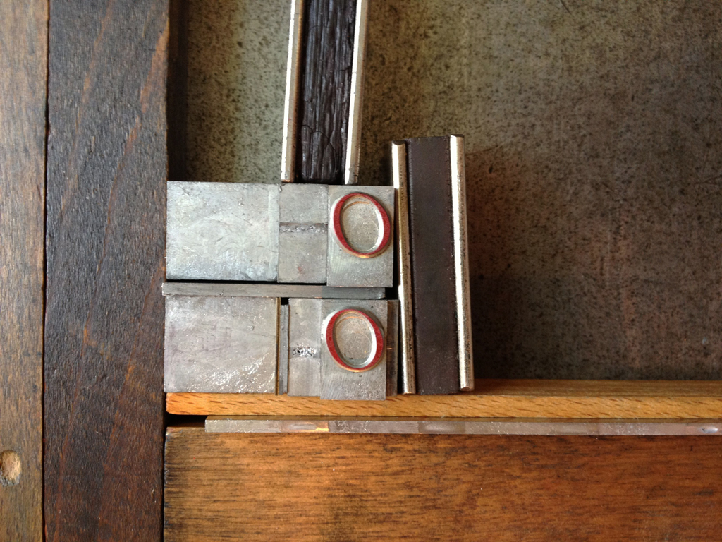Every press in the Wells type shop was humming today, even the creepy one that I don’t like. These books are actually coming together. Look at the image above, for example: Lead type printed on a ghost image after a pressure print using thread, tape and netting. For the same project, here are some O’s being held in place in a not-for-purists style: