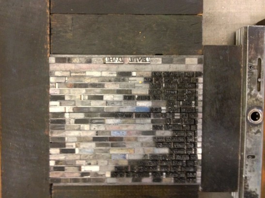 When a proof looks like this, one has no choice but to get one’s tweezers out and start replacing letters. When we started digging them out, we realized that the entire case was full of type with flaws so severe you could see the rounded bad edges even before setting it in place. I tried to take a picture of a particularly pathetic ‘e’ through a loop, but the photo does not do it justice. I include it here out of stubbornness. Please pretend to see how flawed and crushed it is and then, if you want to make me and Nancy happy, comment about it below.