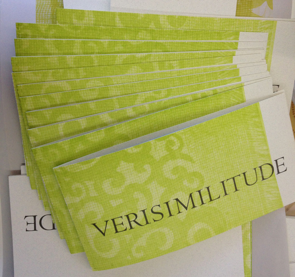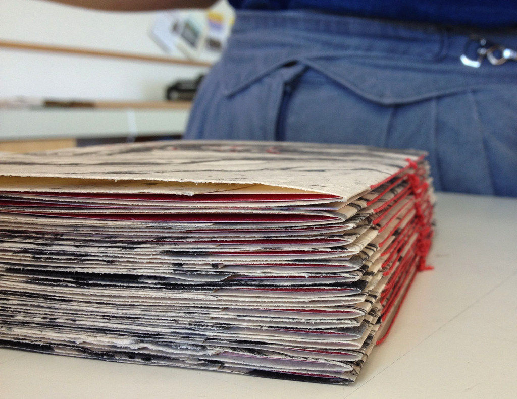 Dominque’s folios, pressure printed from linoleum blocks, fit into an unusual accordion/pamphlet structure.