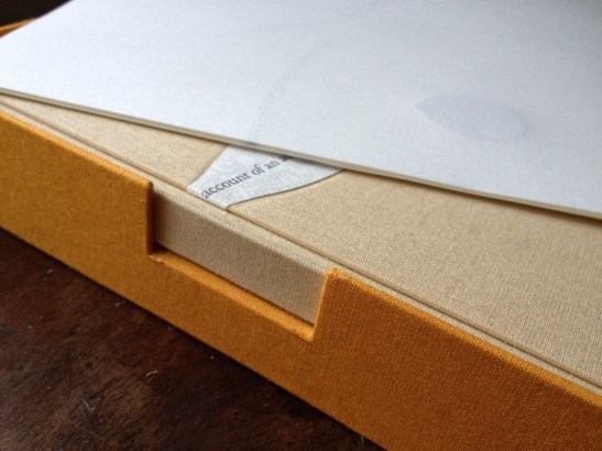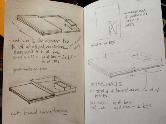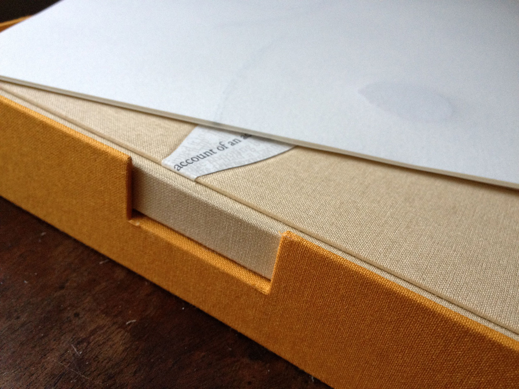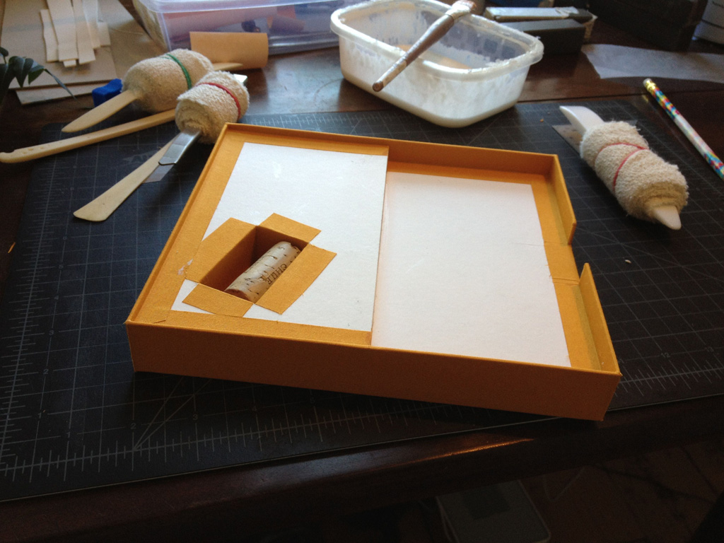So at this point here are my thoughts about it. There will be more variation in color. The recessed area containing the object should be a different color (perhaps the sand color of the book.) I also haven’t ruled out a printed paper pastedown instead of yellow cloth. This would minimize fraying along visible cut edges. I need to tweek the measurements and finalize the labels. I also need to decide if I want the recessed area to be in a random position or not, centered or not, off kilter or square with the rest of the box. But the big decisions are made, and that feels good.