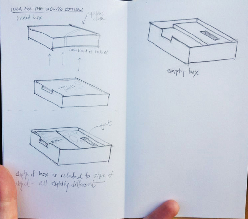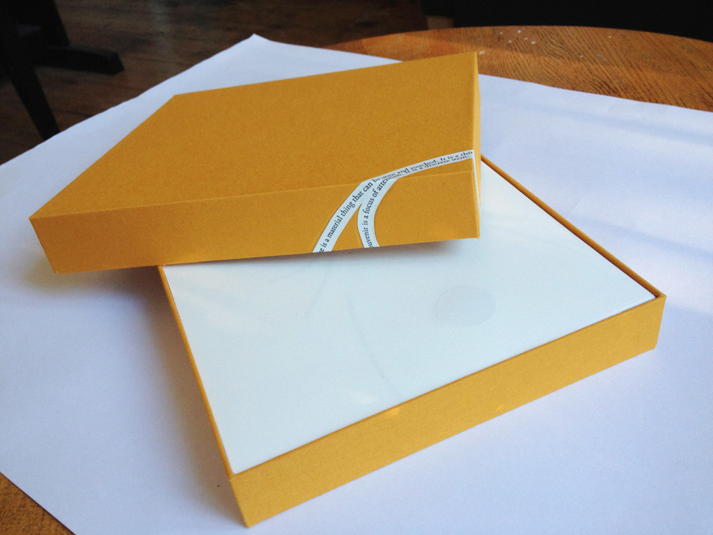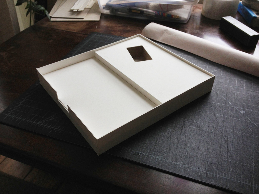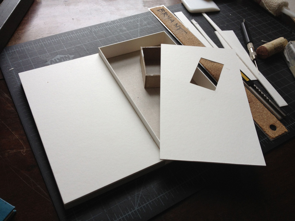 I had initially envisioned the box for this edition to be something similar to the one above; a landscape format clamshell box with the prints laid out next to the book. But I couldn’t figure out where the object would fit in. All of the objects are different shapes and sizes, and so each box would have to be slightly different to accommodate the object it would house. With the clamshell box, this meant the entire box would have to be wider and deeper depending on the object.