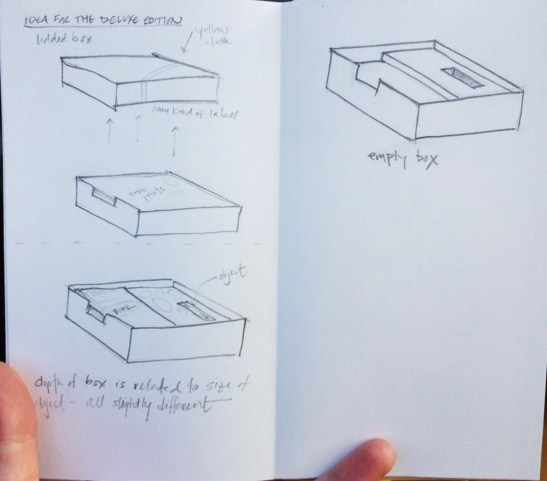 A lidded box works well for several reasons. One, all of the things that need to fit into the box can stack in, thereby minimizing the size of the box. Two, it will be much easier to build a lidded box that can accommodate differently shaped objects (cork, pine cone, film canister etc) than it would be to design a clamshell box with the same considerations. And three, and perhaps most importantly, a lidded box more closely resembles the kind of box that these objects would inhabit on one’s desk or in one’s closet. And that is the point of the book. Lidded box trumps clamshell box. K.O.
