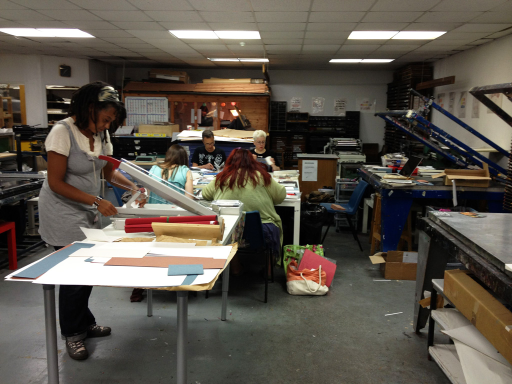 Day two of Bookbinding Summer School at Ink Spot Press here in Brighton. Pamphlets? Done. Double pamphlets? Done. Accordions? Hell, yeah. And now we’re about to put a bullet in our drumleaf bindings. Stay out of our way, we are book machines.