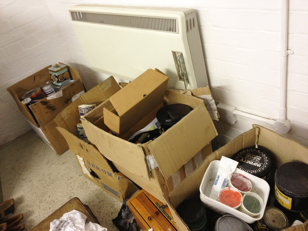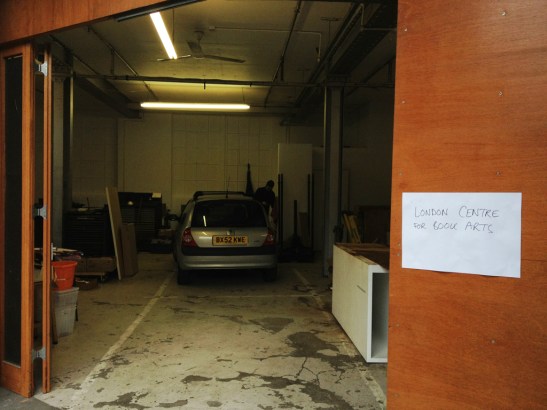 Welcome to the London Centre for Book Arts! Yes, there is a car parked inside of it. Yes, the current sign is a piece of A3 paper. But every day things are clicking along industriously from chaos to organized glory. Yesterday morning, for example, the board shear looked like this: