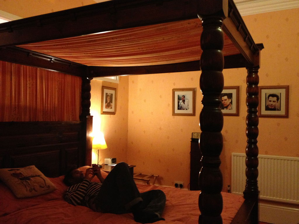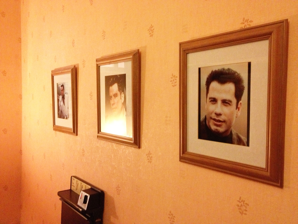 Yes, they are. Framed photos of John Travolta. An enormous four poster bed surrounded by framed photos of John Travolta. It all happened. I was there. I will leave you with this one: