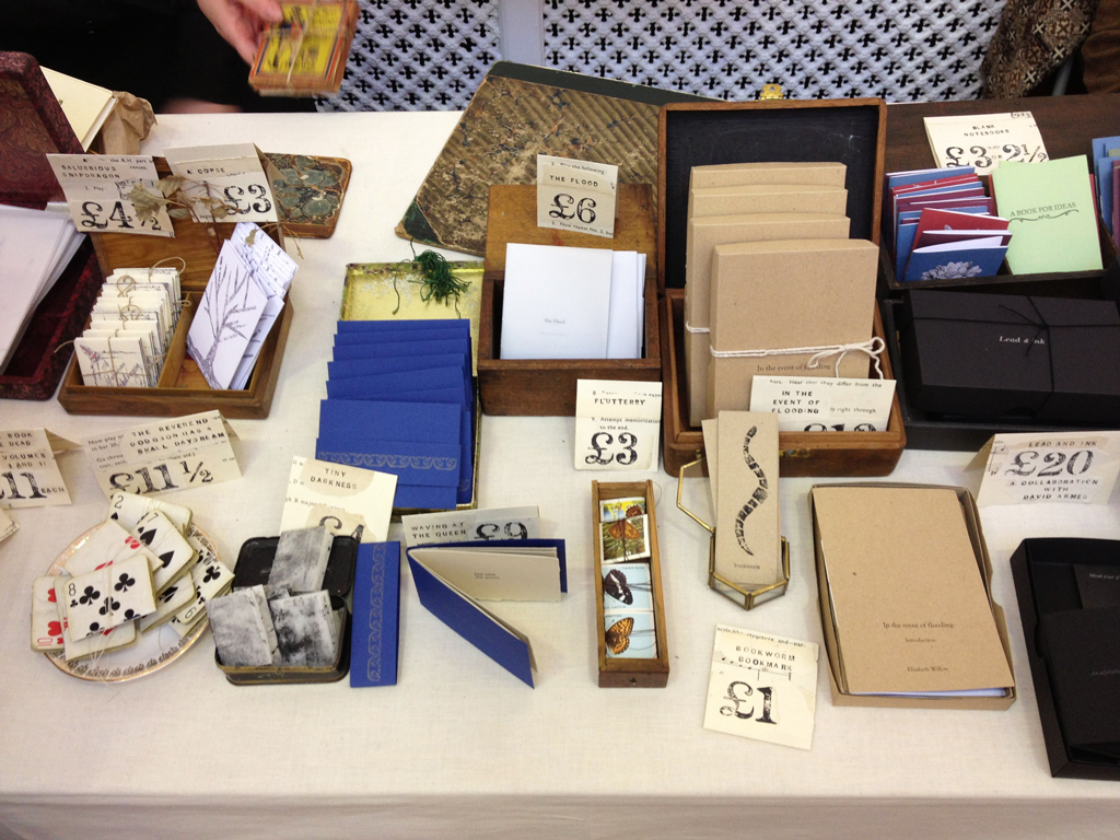 Because I was on my own at my table, I didn’t get much of a chance to wander around the fair. This is a familiar agony: the desire to stay at the table to make whatever sales might be possible as people drift by– pitted against the desire to go touch and investigate the thousands of strange and wonderful books all within forty feet of your chair. I managed to hit a few tables just at the end of the two days, but not enough, not enough, not enough. You can see a list of all the exhibitors here. Here is the table of Elizabeth Willow: