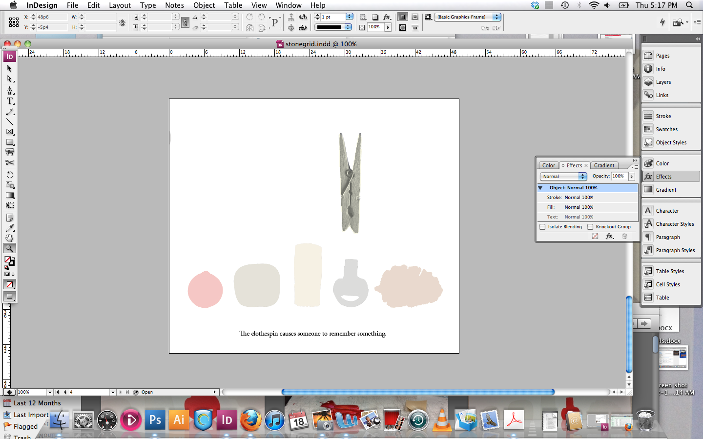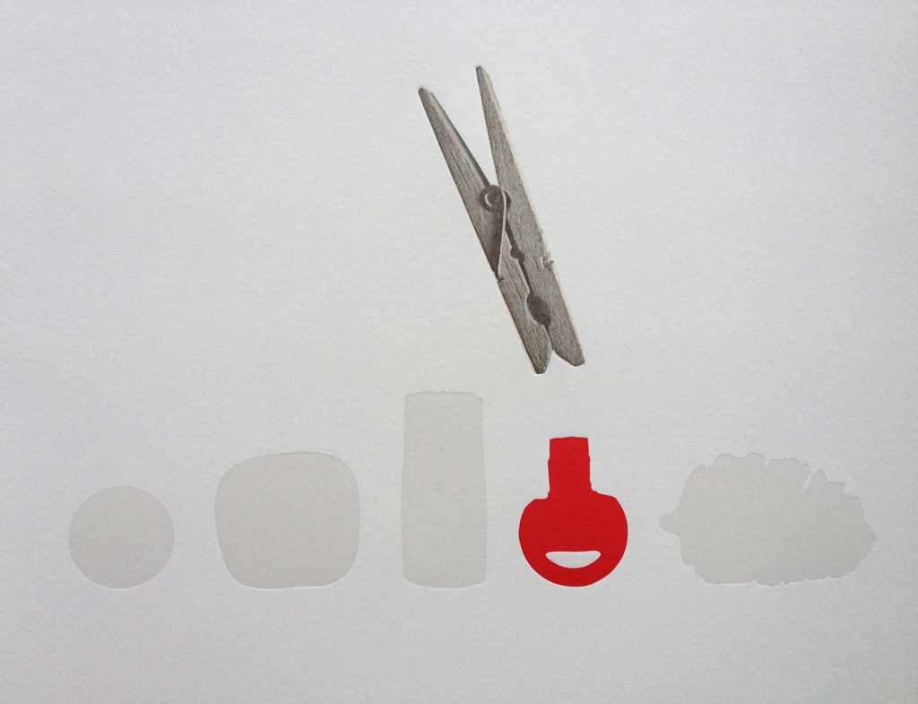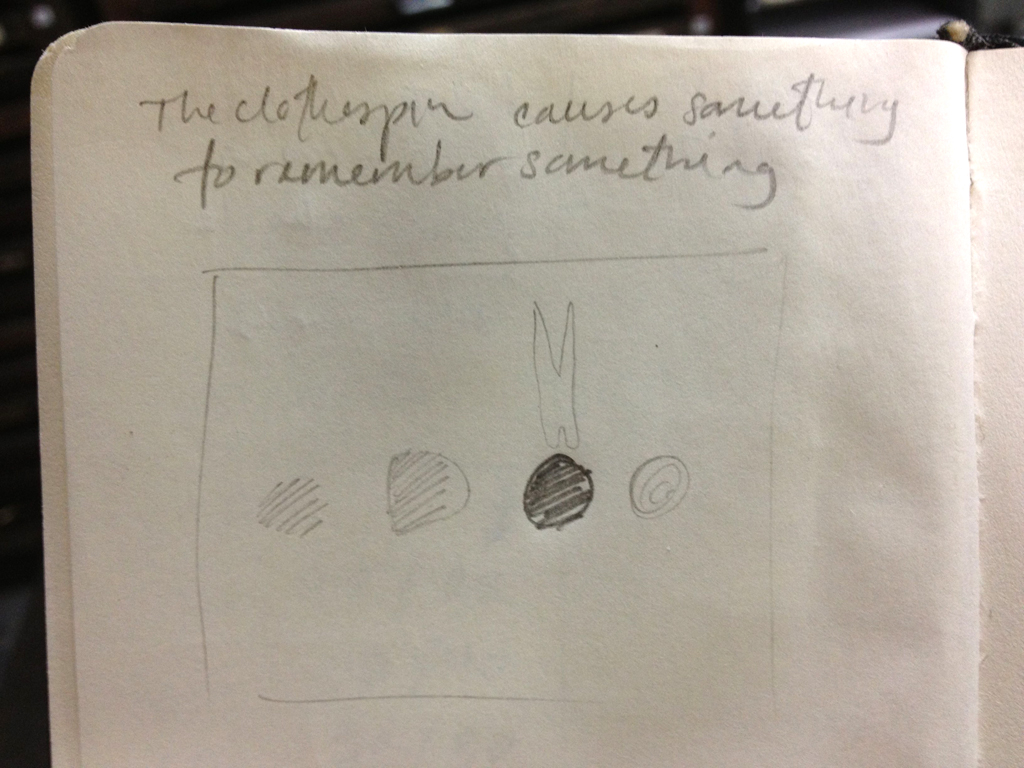 Back to work on the prints. This time: “The Clothespin causes someone to remember something.” (See here for a description of the prints I am producing alongside a book project). As usual, my process begins with a scrawl: