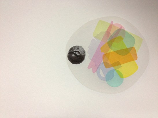 Repetitive color choices and drug addiction jokes aside, I also moved forward on another print yesterday: “The nut constitutes a piece of evidence about the past.” Those of you who have been keeping up with this blog may recognize the image below, a discarded folio from the book project. It didn’t quite fit into the book, but it refuses to be ignored and so it will survive as a print. Here it is, in progress. Look, I put a nut on it.
