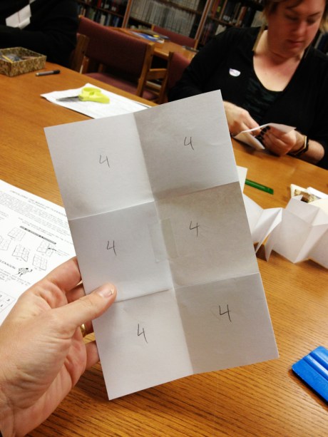 In addition to unleashing us in this glorious book petting zoo, Max also demonstrated some one page book structures. Below: my first flexagon!
