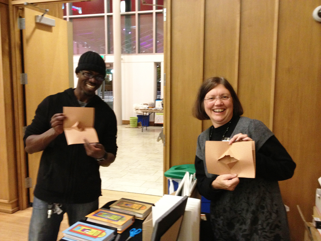 The Pyramid Atlantic Artists’ Book Fair has come and gone! Aren’t you sad you missed it? Here is a tip: For kicks, share a table for two days with the Queen of Pop Up Books, Carol Barton. It took her all of ten minutes before she couldn’t hold back the tide of paper engineering: