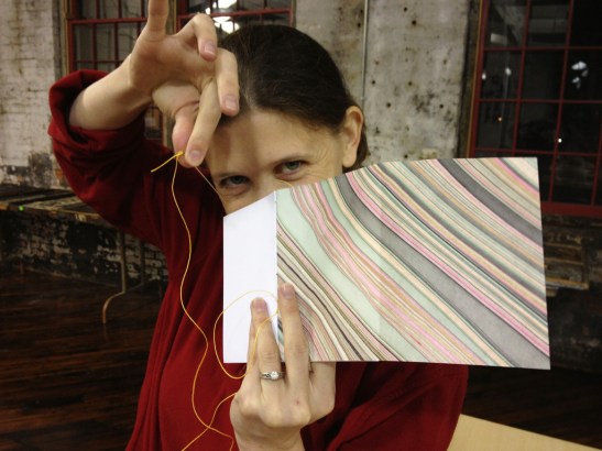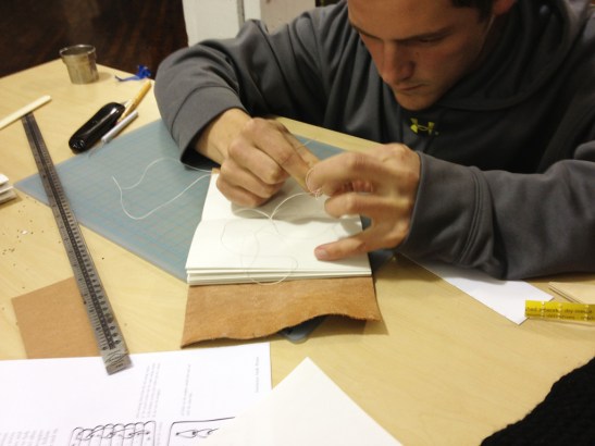 Monday, 26 November. Time to spread the word about the link stitch binding. Below, Cadance  sews her book with a touch of intrigue, as is appropriate for this structure. And so begins a three part bookbinding extravaganza at The Cracker Factory in Geneva, NY.