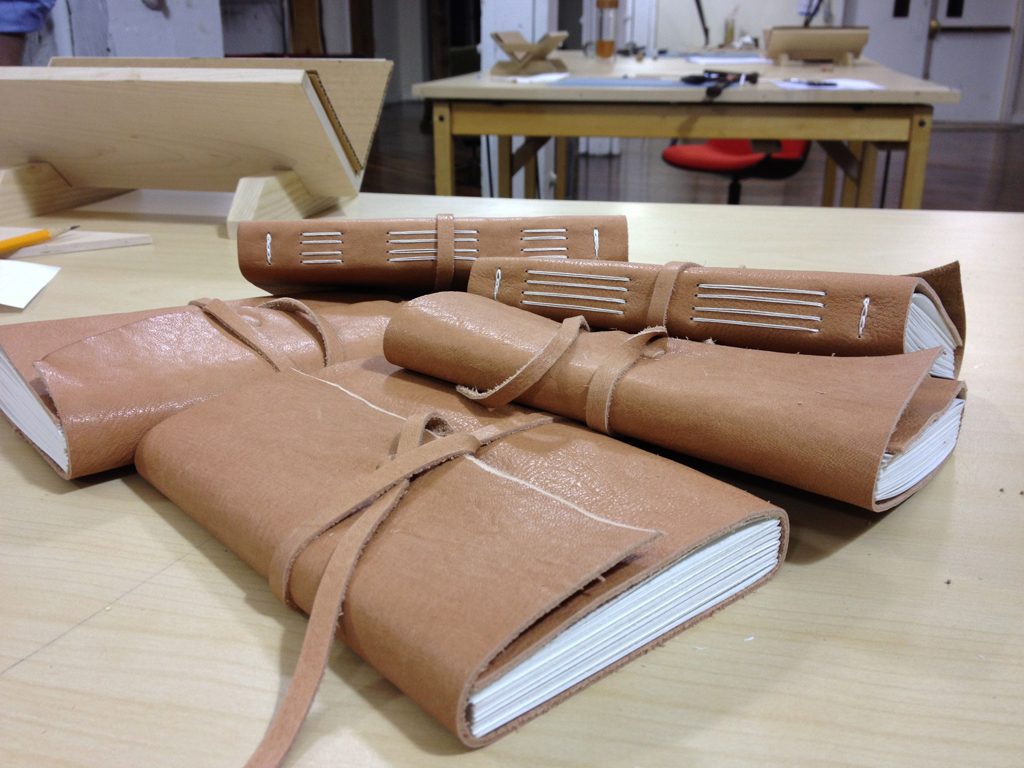 Tuesday, 27 November. Break out the leather! Leather scraps are one of the benefits of binding books one flight up from Miles and May Furniture Works. These scraps may have been rejected for use upholstering the most beautiful chair in the world, but they are just right for the long and link stitch. As you will see below.