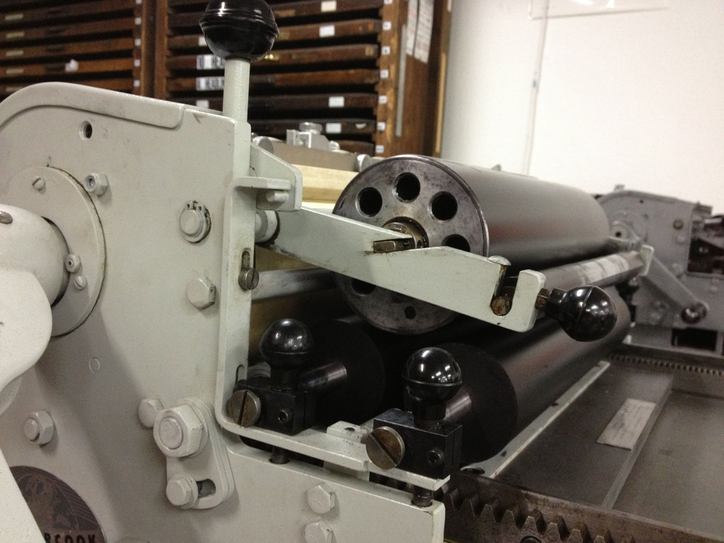 When you’ve got all of the rollers where they should be, you are ready to lock up your type and get going. Checking and adjusting the roller height should be simply a part of your routine. Different presses have slightly different roller assemblies, but the essentials remain the same.Right to Raise, Left to Lower, Right to Raise, Left to Lower, Right to Raise, Left to Lower, Right to Raise, Left to Lower, Right to Raise, Left to Lower, Right to Raise, Left to Lower, Right to Raise, Left to Lower, Right to Raise, Left to Lower, Right to Raise, Left to Lower, Right to Raise, Left to Lower, Right to Raise, Left to Lower, Right to Raise, Left to Lower, Right to Raise, Left to Lower, Right to Raise, Left to Lower, Right to Raise, Left to Lower, Right to Raise, Left to Lower.