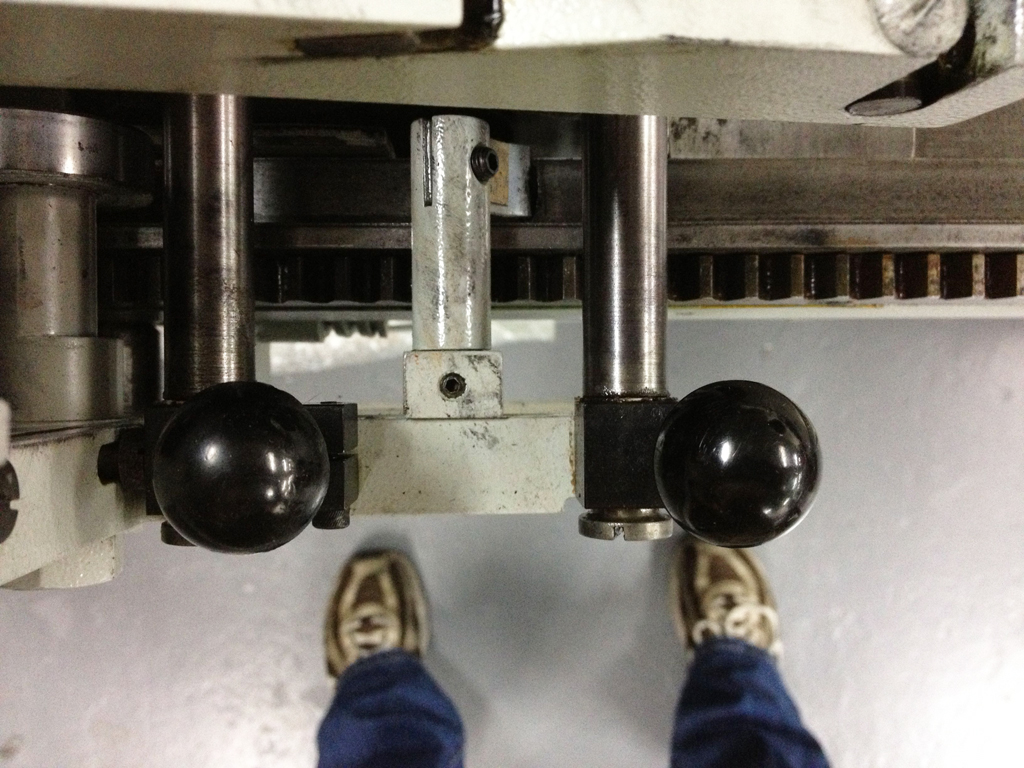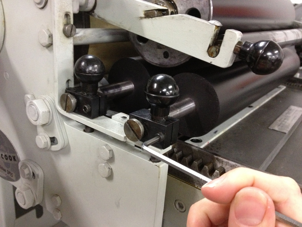 Great. On a Vandercook SP-15 (and many other Vandercook models, including the SP-20 and the Universals) The rollers are adjusted by turning the small knobs on either end. BUT WAIT. First we must unlock them. These little knobs should be difficult to turn at first. This is because they are pinned in place by a little set screw that can be released using an allen (or hex) key.