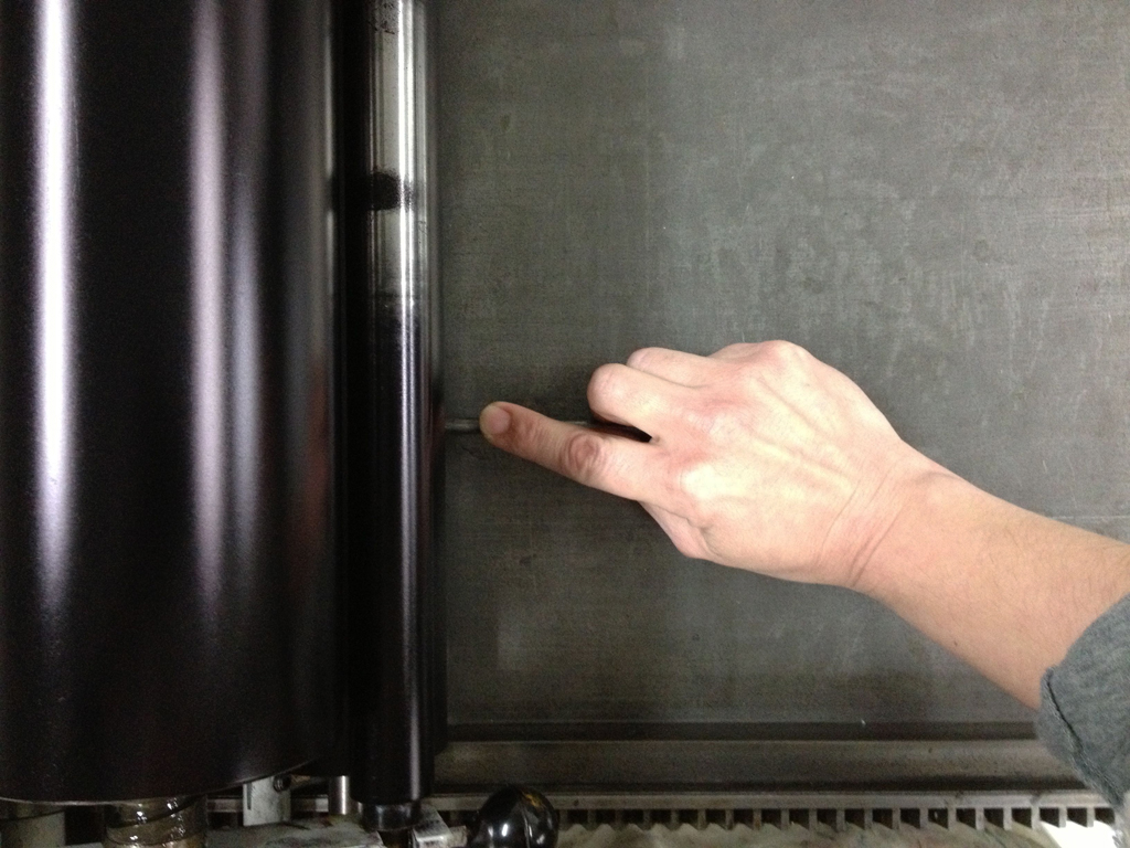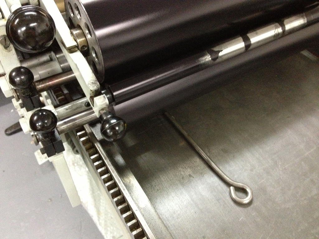 You should check the height of the rollers after you have inked the press, but before you have locked your type into the bed. Make sure the rollers are down (and rolling) and bring the cylinder a few inches forward from its resting position so that it is sitting roughly where your type will be. Set your gauge on its curve in the bed of the press, about four inches from one side of the bed and away from the rollers. Forcefully push the gauge under the front roller, bring it back, and have a look. Like so:
