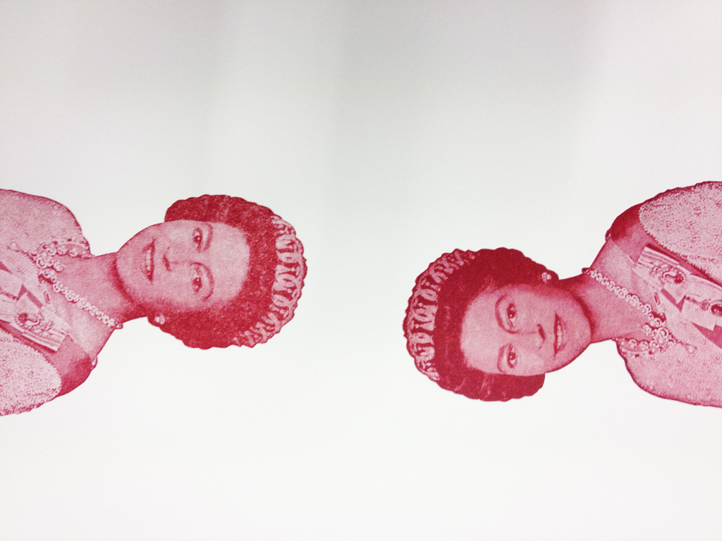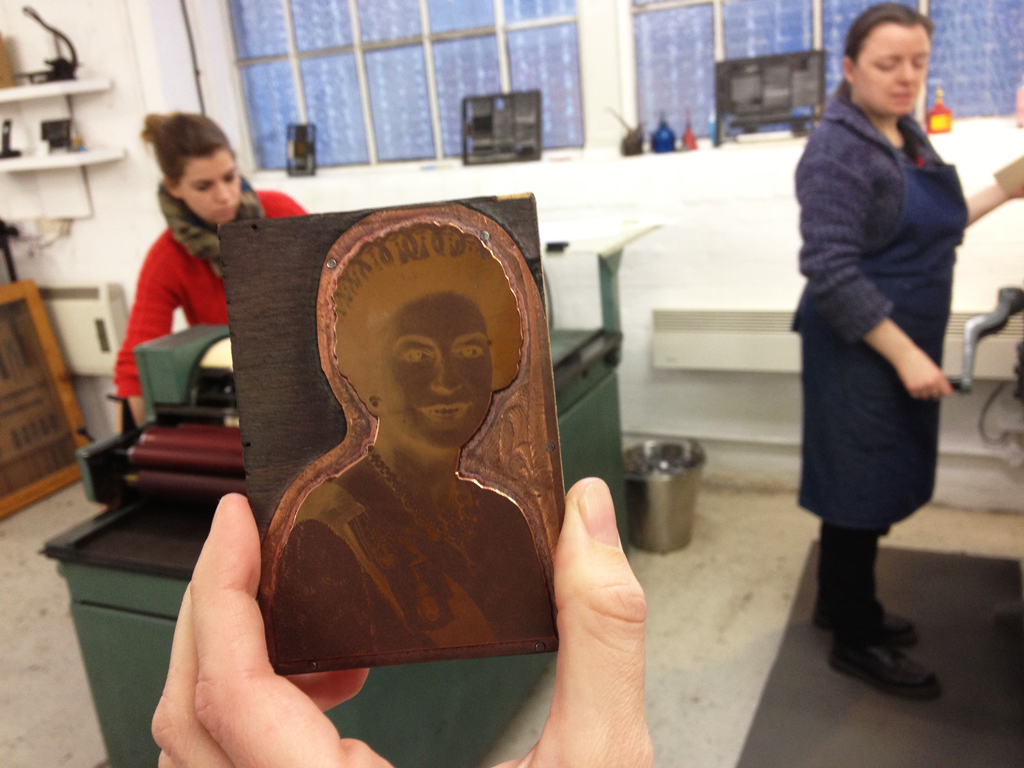 Teaching also offers a chance to goof off and print lighthearted things. Like the Queen, for example, here preserved in all of her 1950’s glory on an old cut at the London Centre for Book Arts.