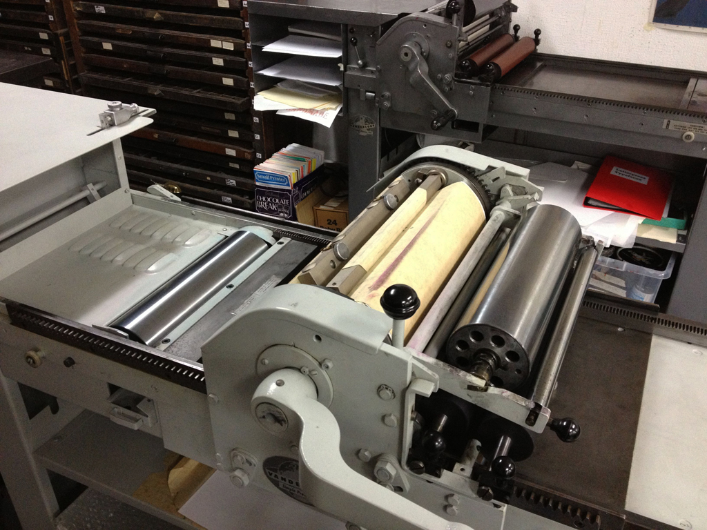 The process of letterpress-printing is a relationship between two basic variables: How much ink is applied to your printing surface (type, lino block, plate, etc.) and how much force you used to press your paper against this surface. More briefly: Printing = Inking + Impression. You can be inking your type perfectly, but if your paper barely touches that type, the printed text will look gray and unconvincing. Conversely, you can have a perfect amount of impression, but without enough ink applied in the right way, your text will not print correctly. Knowing how to adjust the packing (the paper wrapped around the cylinder which determines the amount of impression) is as important as knowing how to ink a press.