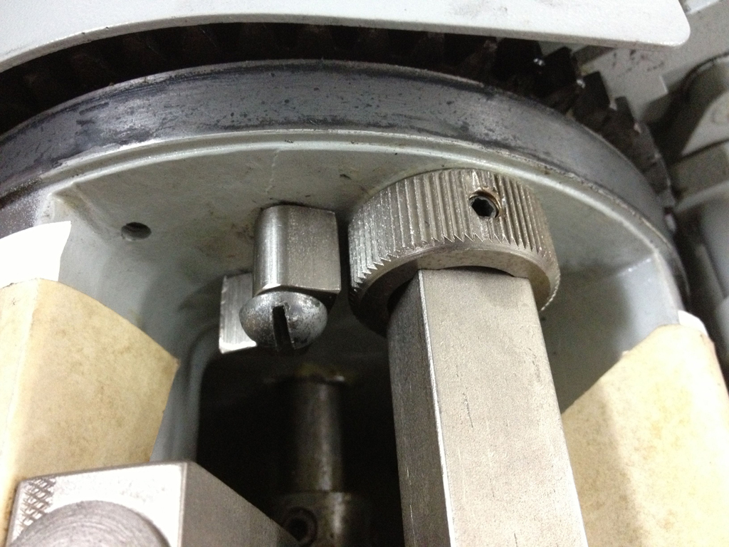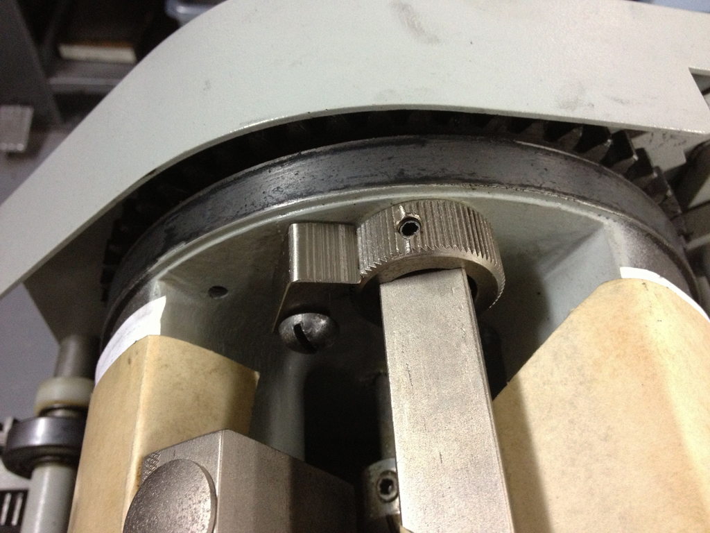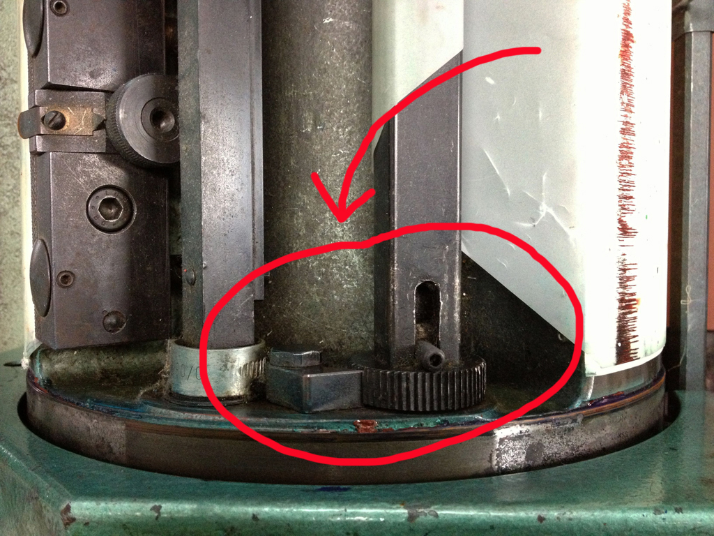 I am working on a Vandercook SP-15 here, but a ratchet and pawl (confetti!) tightening system will be found on any flatbed cylinder press you please. Here it is on my new FAG-40.