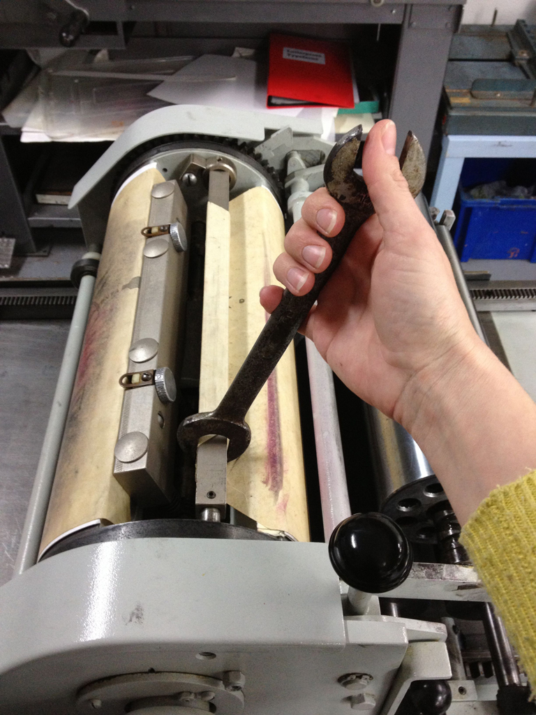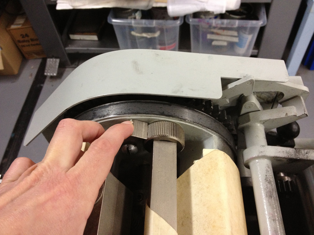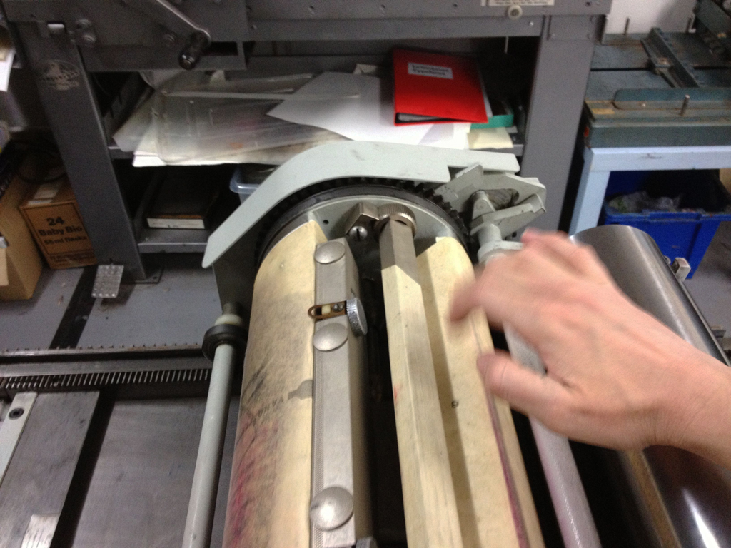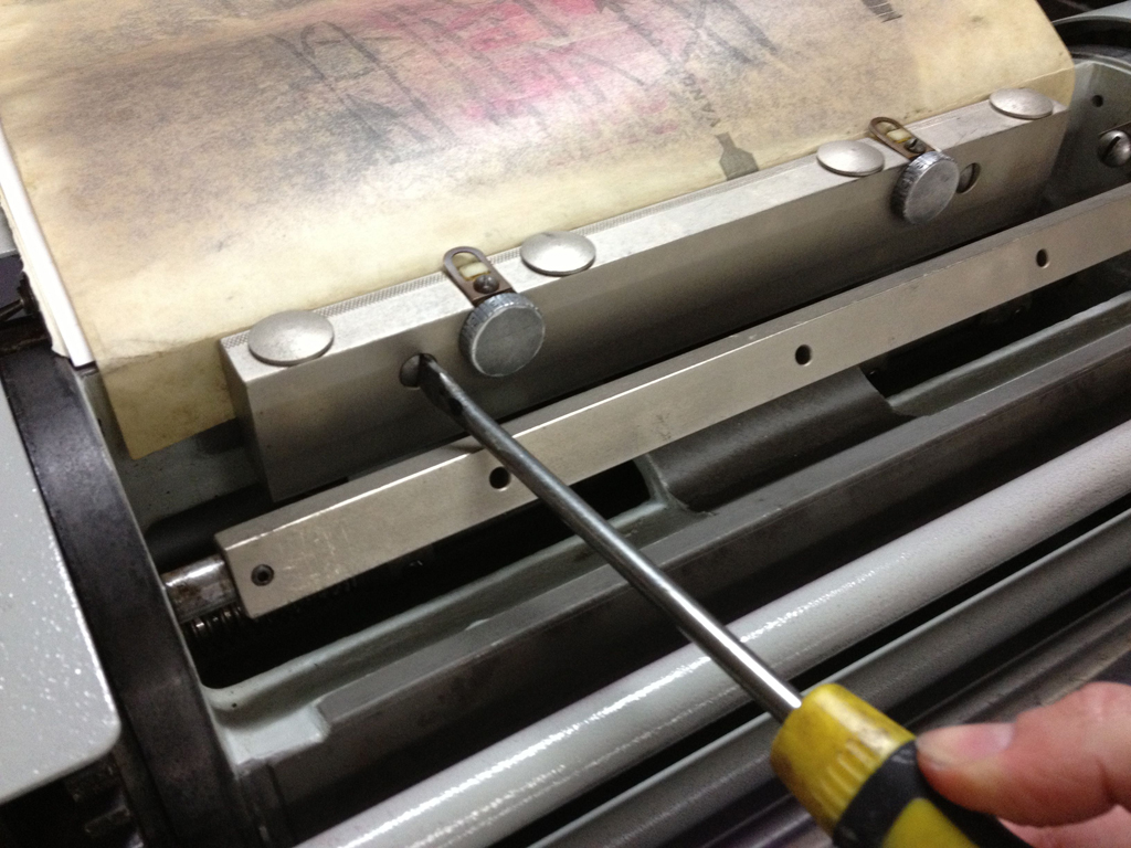 Once you’ve unwrapped the paper, you might see (as above) three holes along the bar. This press once had a narrow, removable strip of metal with little pegs on it that fit into these holes. It was used to pin the paper in place and help secure the drawsheet to the bar. You rarely see these bars now; they had a nasty habit of falling into the cylinder, forcing the printer on hand to spend ages fishing it out again. The paper does a fine job of holding itself in place all by itself, and so most of these extra metal strips have gone to Vandercook Heaven.