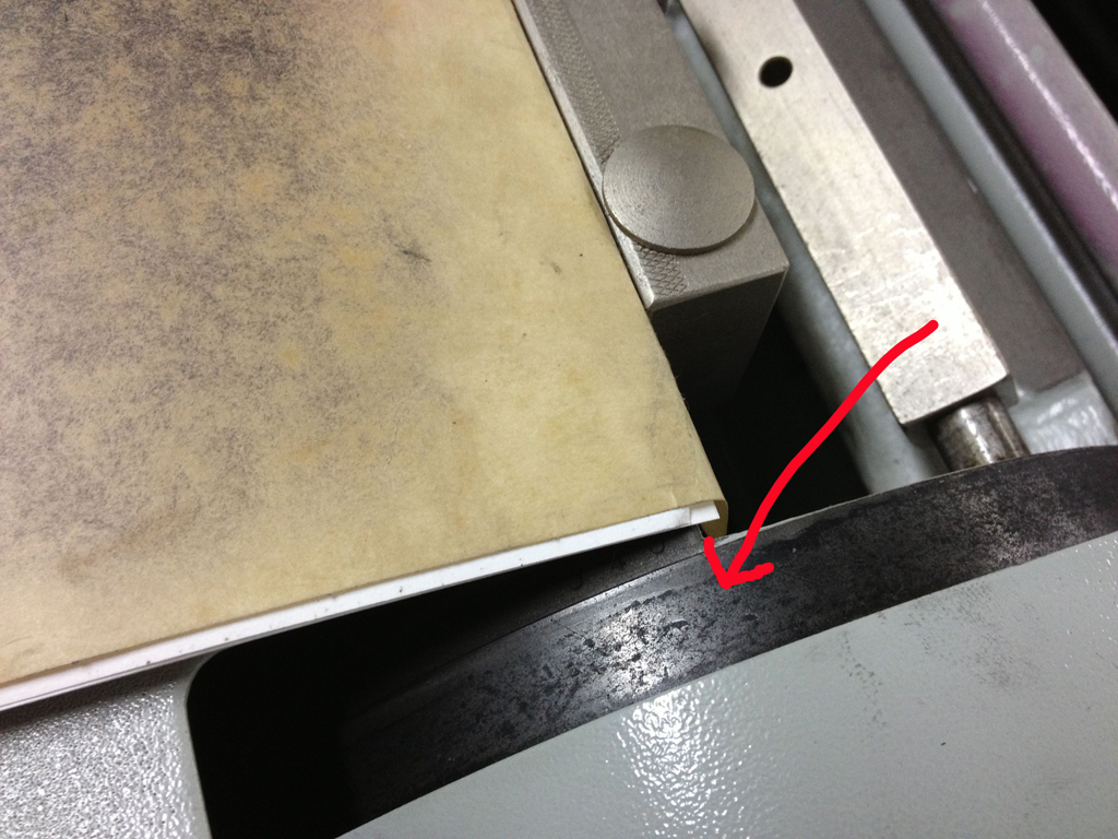 Get rid of it and cut yourself some new sheets of paper. Letterpress printing is like the Princess and the Pea. Even a tiny indentation will make a difference to your printing. Banged up packing (as above) will give you a faint ghost-of-projects-past (I know I am mixing my fiction metaphors here) on your own printed sheet. Make sure you cut fresh sheets to the size of the rest of the packing, the width of the cylinder. It is tempting just to use whatever paper is lying around of any size, but life is better when things are done right, especially in a shared shop.