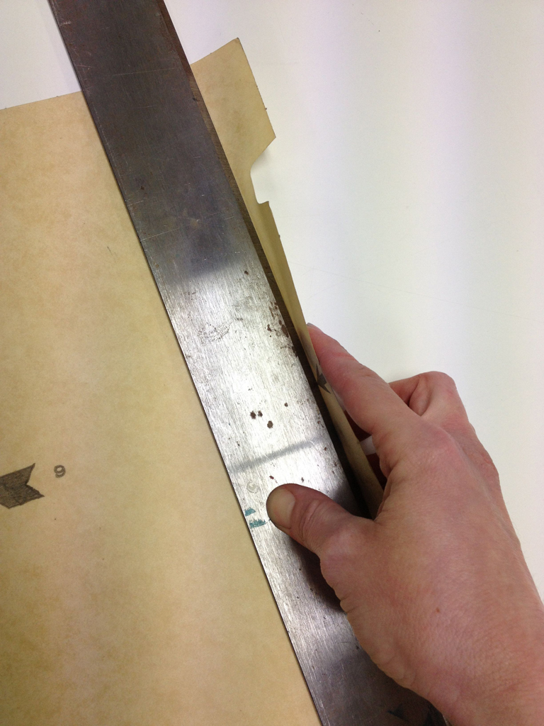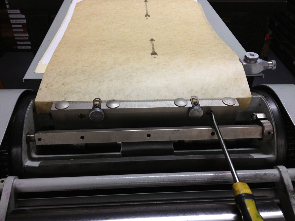 If you can’t find one, don’t panic! You just need to cut a drawsheet for yourself. The vandercook oiled sheets (above) are lovely, but you can make a drawsheet out of almost anything. Acetate makes a great drawsheet in a shared shop (it is durable and easy to clean when someone has printed on the packing by accident.) Use the old drawsheet as a template, and cut a new one out of the material that you choose.
