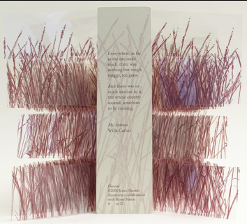My Antonia about the ‘rough, shaggy, red grass’ in which Karen Hanmer’s Bluestem finds its subject. Exquisite words chosen by the author, and the artist gracefully moves us through the metaphor through pure visual construction. The illustration is printed on acetate and on the two paper accordions that form the structure of the book, which is based on the Flag Binding created by Hedi Kyle. Hanmer uses the structure to its best advantage: It is the printed acetate panels that complete the gesture of the book and deliver the feeling of ‘so much motion’.