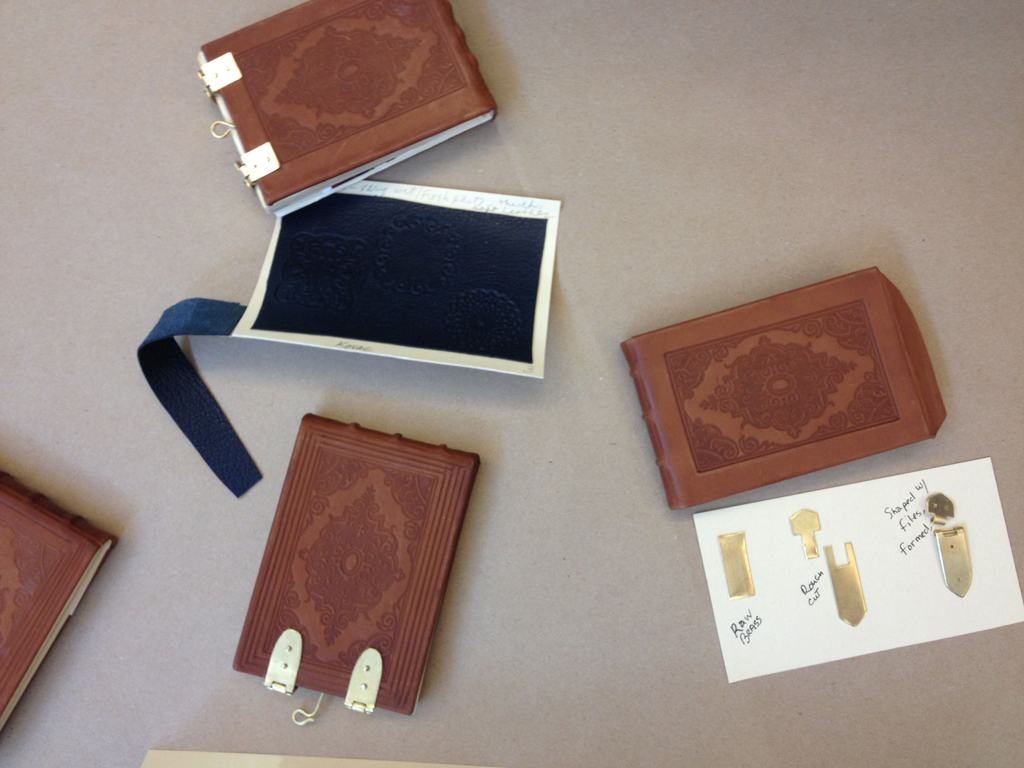 Full disclosure: It doesn’t close. But I made the thing and so I have a bit of pride about it. Here it is in context, Pam Spitzmueller’s bookbinding course at the Paper and Book Intensive, which I was able to take after I taught a pressure printing workshop the week before. Some of these clasps look a little nicer than our clasp, but all of the books are adorable and small.