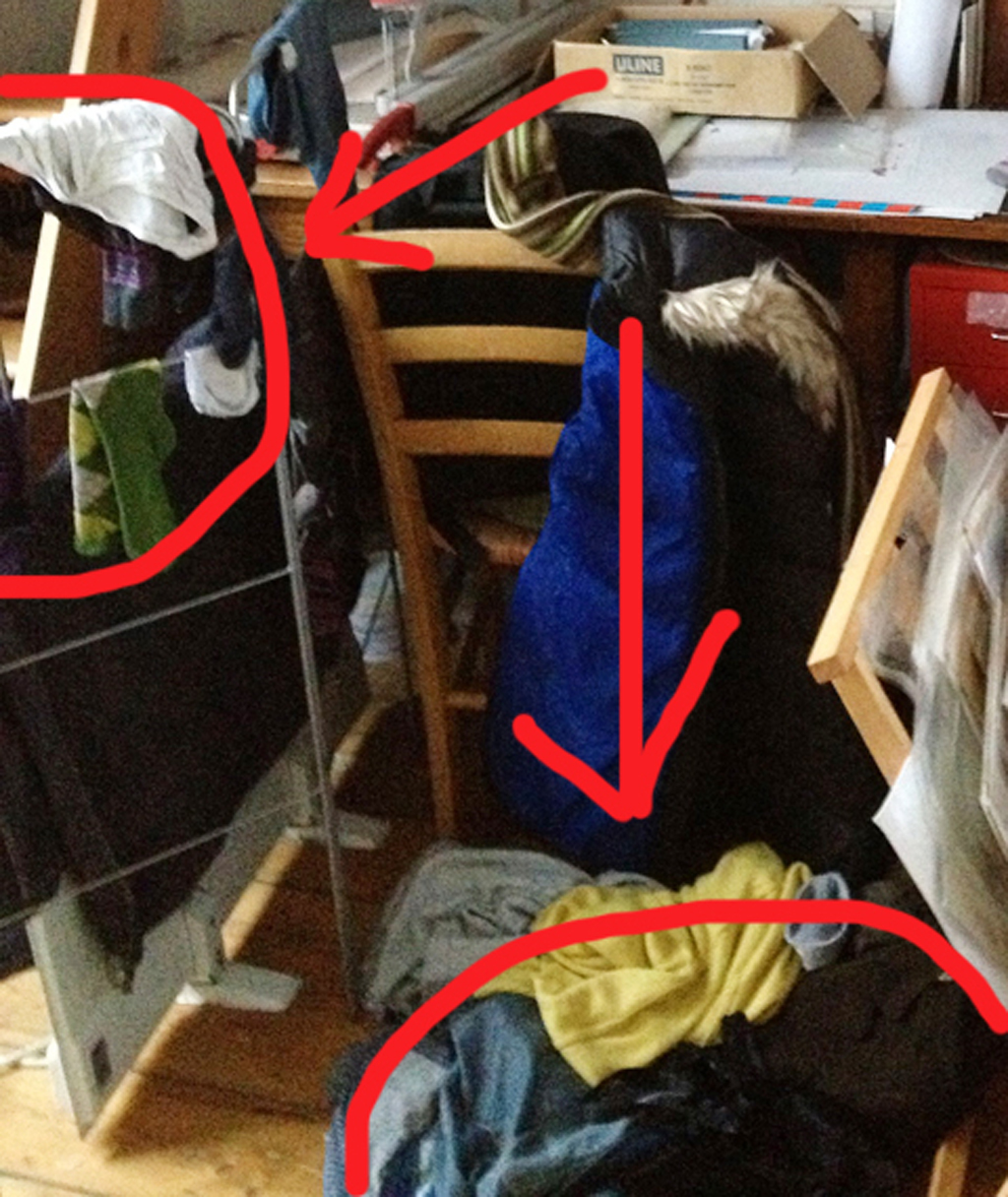 BEFORE: paper storage on a warped MDF board tucked behind ladder leading to lofted bed: