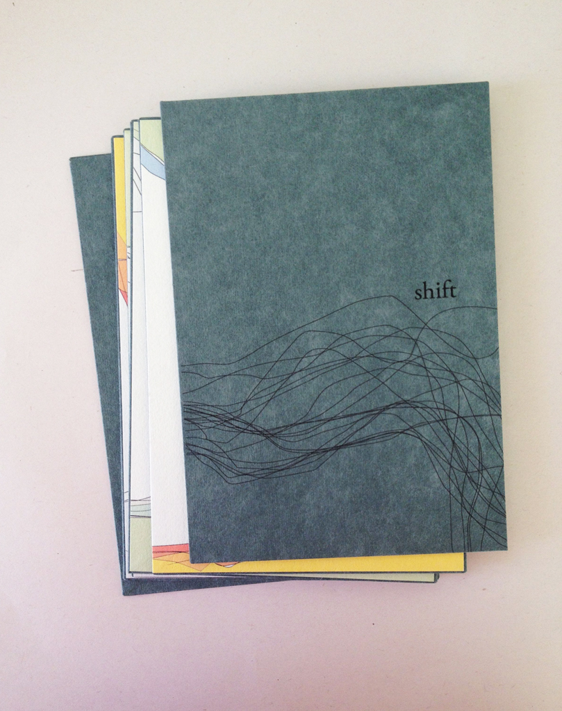 The specifics of the project: Each of the five of us will design, print and bind a small edition of an 11×16 cm book with the theme or title of Shift. An accompanying print of larger size will reemphasize that theme by forcing a shift from three dimensions to two, from small to large, from sequential to static. We will house the five books together in an enclosure. This project physically marks the beginning of our collaboration and will ideally serve as a catalyst for future ambitions, new group projects, exhibitions, and a catalog.