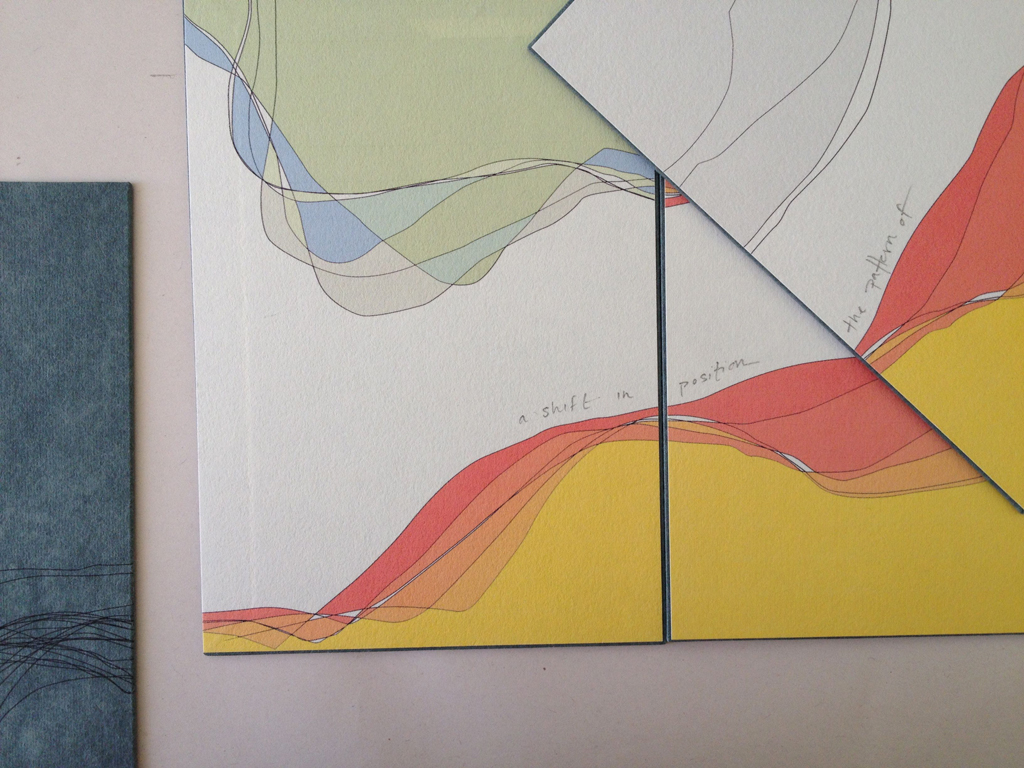 Oh, hello, it’s me again. Since writing that post there has, unsurprisingly, been a shift in the nature this book. I’ve moved away from the spine entirely and am now constructing individual panels that can be rearranged and flipped over to view different sections of interplaying lines. Here is a new mockup in full swing:
