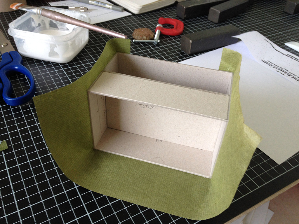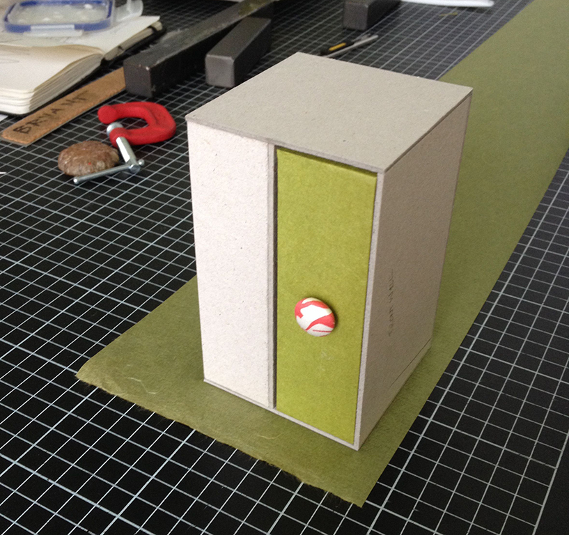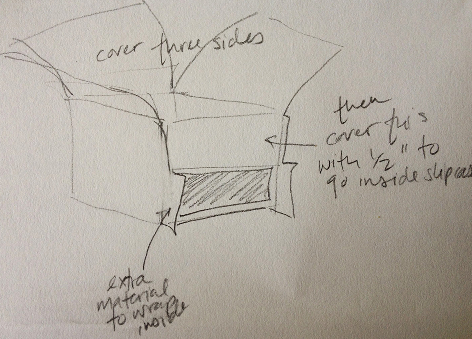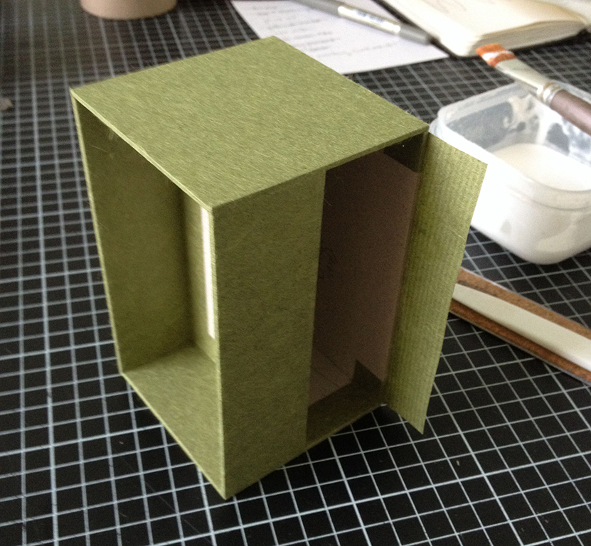 Yesterday I finally got all my paperwork in to Penland for the boxmaking class I’ll be teaching in August. It got me all in a box making mood, so I decided to spend a few hours and make a box with a drawer in it. When I am out of practice with a structure or trying something new I usually make a quick sketch to try to think out the cuts. The measuring and the sequence of covering a box is always tricky in a weirdo, loopy box like this one, but if I concentrate for a few minutes I can come up with a rough plan. This box will essentially be a complicated slip case, so I make the drawer first and I’ll build from there.