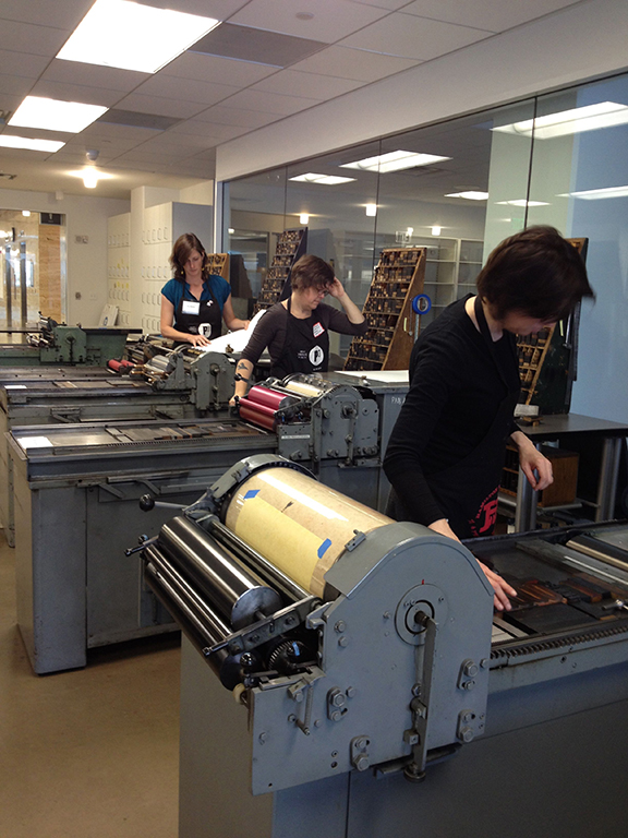On Saturday, January 4 we manipulated the language gathered from your tweets and set them in metal and wood. (As I mentioned in my last post, we collated tweets using the hashtags #printedword, #woodtype, #letterpress, #shiftlab and #CBAA between January 2-4 and used them for a collaborative printed project.)