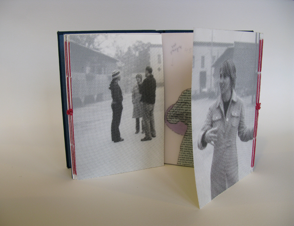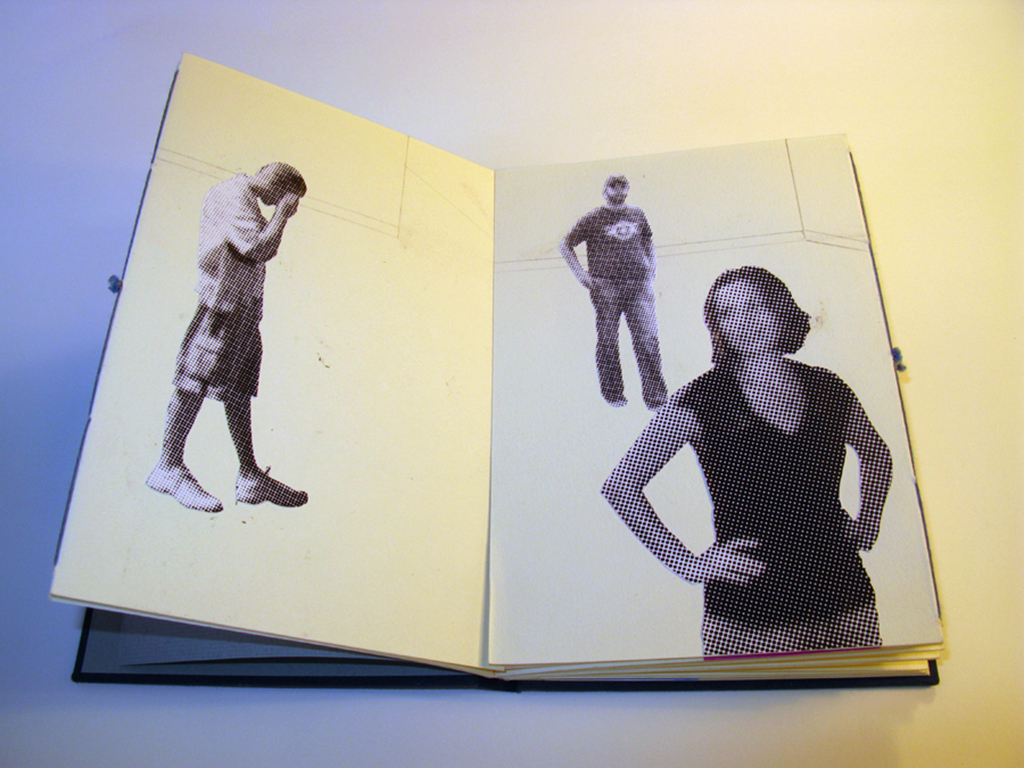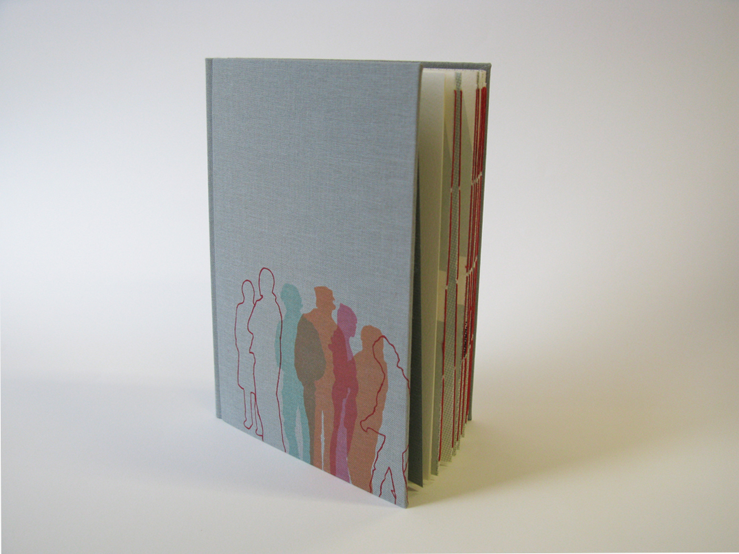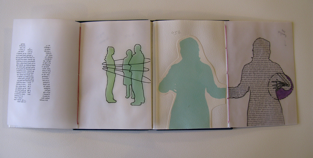 I designed, printed and bound Point of View in 2008 as my thesis project for my masters degree from the University of Alabama Book Arts program. Initially envisioned as a dissection of different portions of a room, it became a rotating investigation of one position and moment in time. Four views of groupings of people from one spot are dissectable by peeling away layers of translucency. You can see a short video paging through this book here.