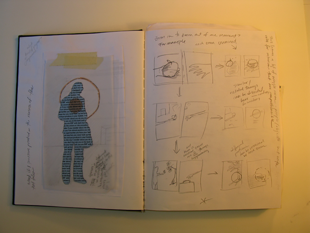 What to dissect? and how? The core of the book needed to be addressed before I could make any real progress, and so began a long process of drawing and experimenting with text and imagery. Do I retain the scale from page to page or zoom in? Do I dissect inanimate objects or people or both? Do layers of dissection include text? Will the dissections be straightforward and anatomical or reveal unexpected elements? Simultaneous to these fundamental issues issues of content, I needed to determine how to structure the binding of the book to facilitate a dissection. Do I move from page to page in a traditional way, each time revealing something new? Do I lift pages up like a clipboard? Do I employ translucency? Will the book be a codex? An accordion? Or something different altogether?