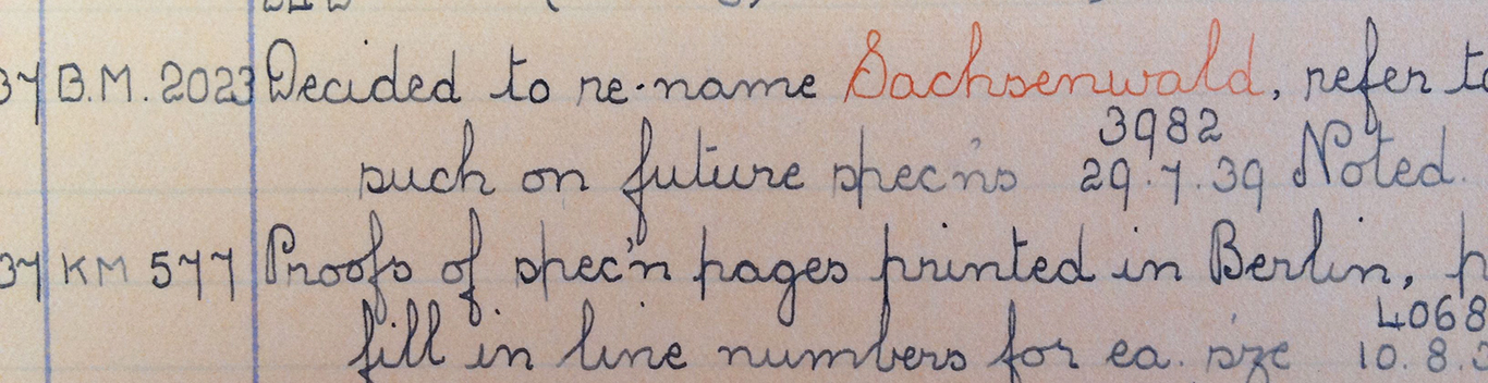 Sachsenwald (Saxon Forest) the name chosen for series 457 in July 1937, perhaps seemed more benign and romantic than the nationalistic ‘Bismarck’, on the analogy of the Schwarzwald (Black Forest). The Sachsenwald, north of Hamburg, was an estate given to Bismarck by the Kaiser in 1871 to acknowledge the part he played in creating the ‘German Empire’ (Deutsches Reich) and it remained in the possession of his family. But the ‘Sachsen’ part of the name is still pretty nationally charged, like those of the names of other contemporary Nazi texturas in this ‘jackboot grotesk’ [Schaftstiefelgrotesk] style, like National, Element, Tannenberg, Deutschland. Some of the elements of the name Sachsenwald would later acquire grisly associations, like the names of the Sachsenhausen and Buchenwald concentration camps. Did Morison, or possibly S. H. Steinberg, have any part in the choice of the name?