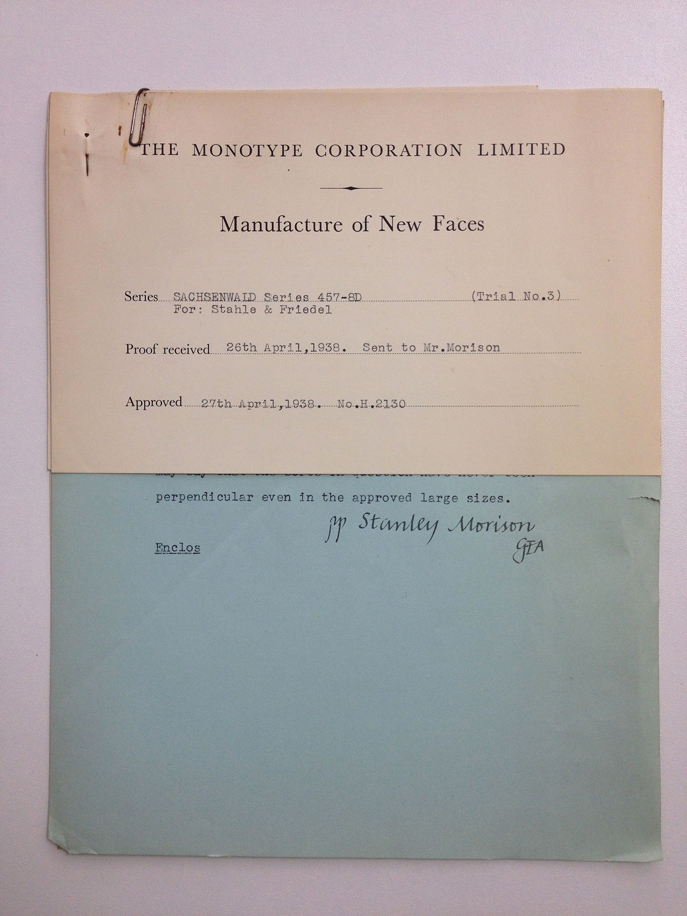 Enthusiastic thanks are due to Toshi Omagari for sharing the archive with me and for his help with interpreting the Sachsenwald documents. He’s written about another Ullstein typeface here. Any mistakes in this post are mine. Thank you, Monotype, for making it possible to visit. Thanks Ben Mitchell for letting me tag along on a type designer field day, and thank you Michael Bixler for telling me a sad story in 2006. For more information about the Bixlers and how they cast metal type from monotype casting equipment, have a look here.