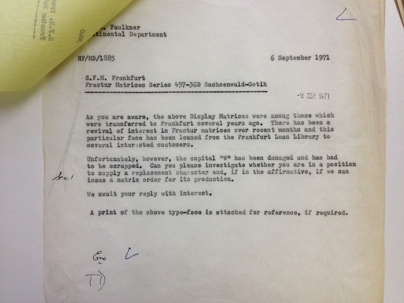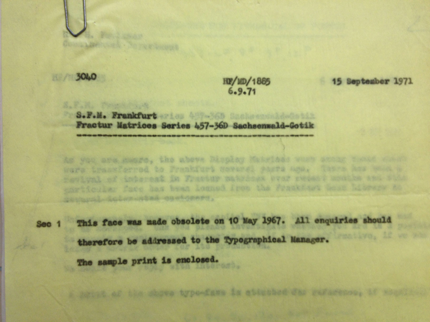 Two sets of matrices for casting Sachsenwald were finally produced, but by then, demand for such a typeface simply didn’t exist. It remained on the books for several years until 1967, when we find the most melancholy document of the bunch: