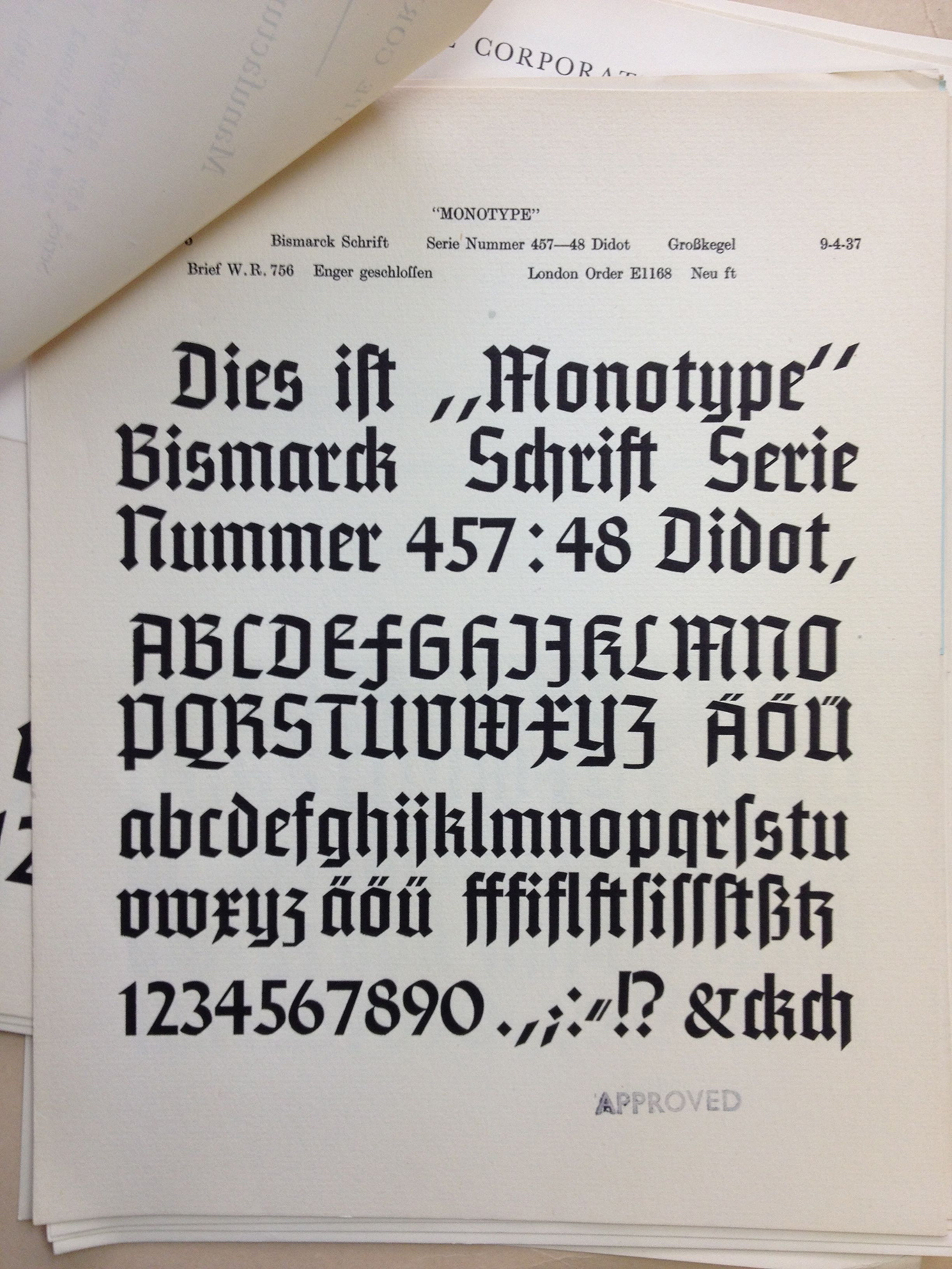 From looking through the notes on Bismarck, it becomes clear that Monotype was hoping that this type would be appealing to English readers and/or clients. See a note here on May 4, 1937: