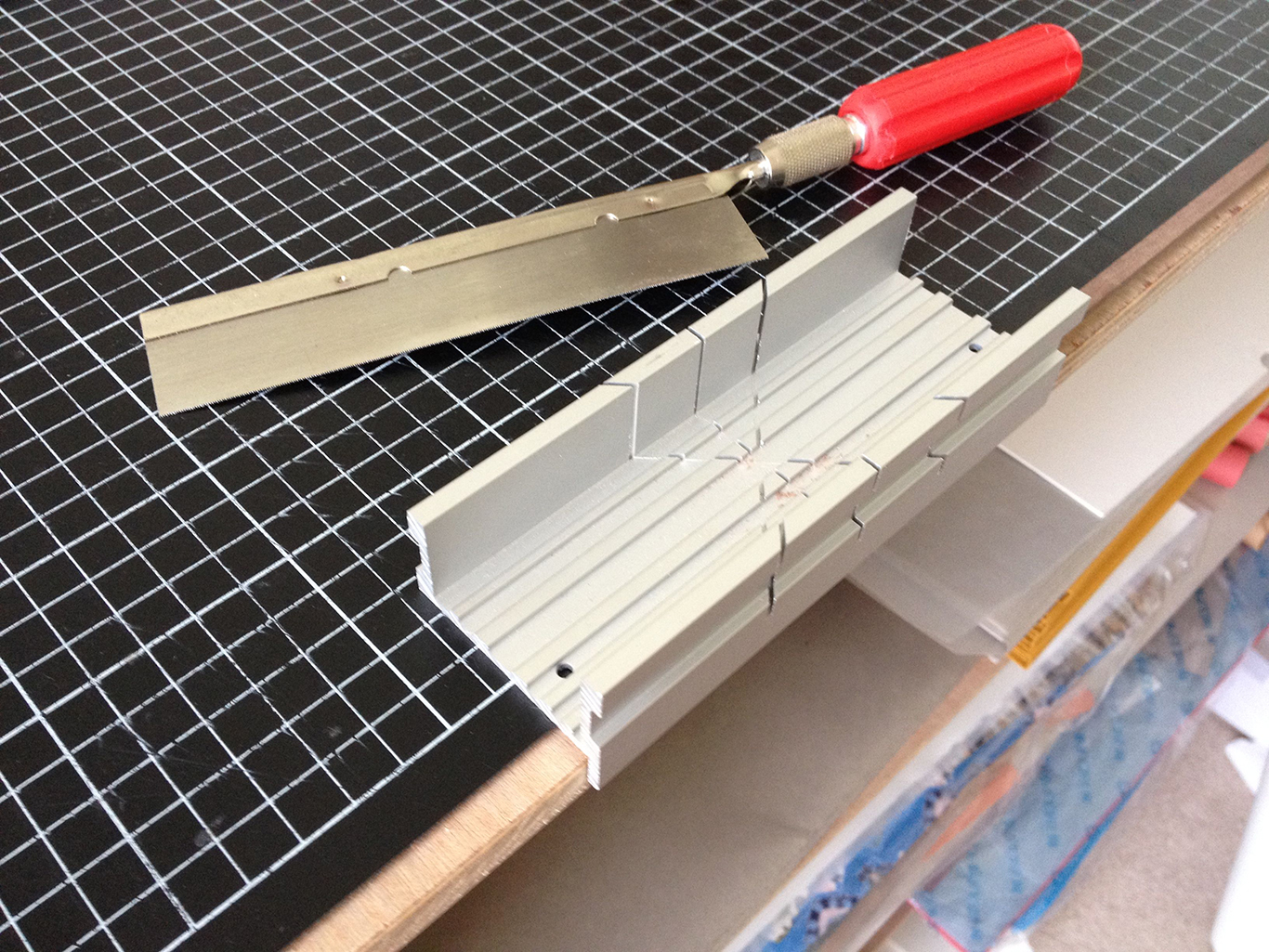 And when one is shopping at a model company for tiny strips of wood, how can one resist a tiny saw? And once one has bought tiny strips of wood and a tiny saw, and one knows that one has plans to make tiny corners, one simply must invest in a tiny miter box, mustn’t one? Anyway, that is what this one did.